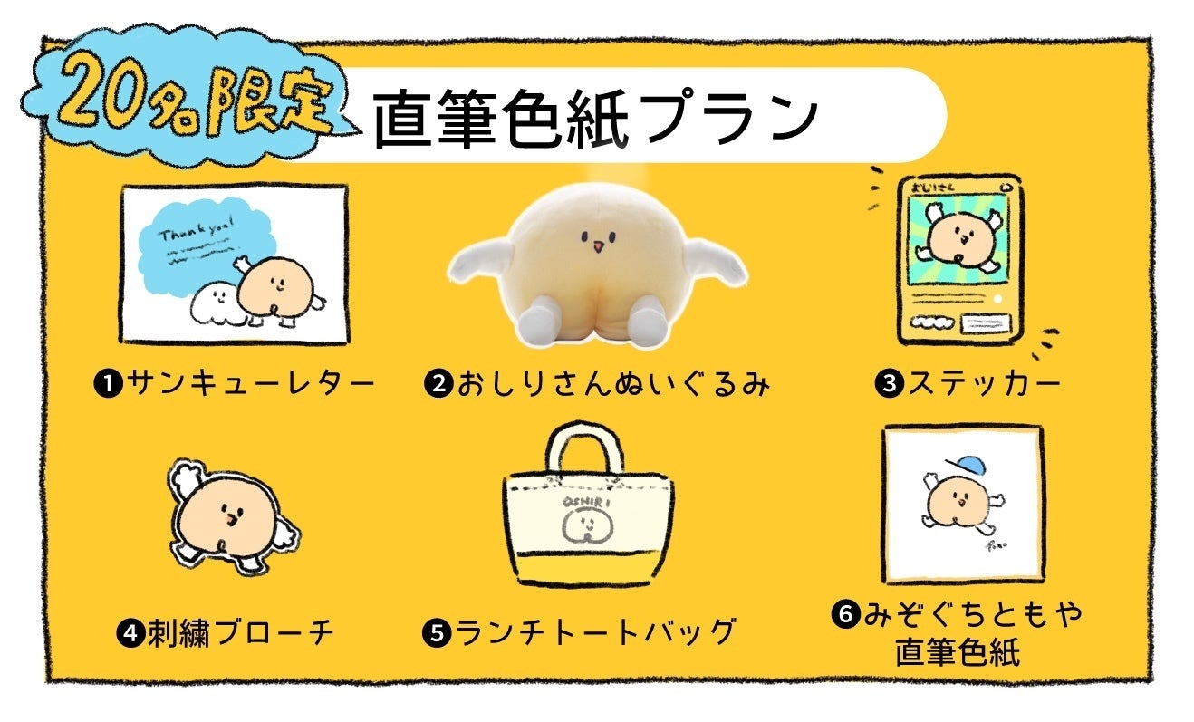 「あなたの好きなもの」と「おしりさん」を描いた みぞぐちともやさんの直筆イラスト色紙をお届けします!