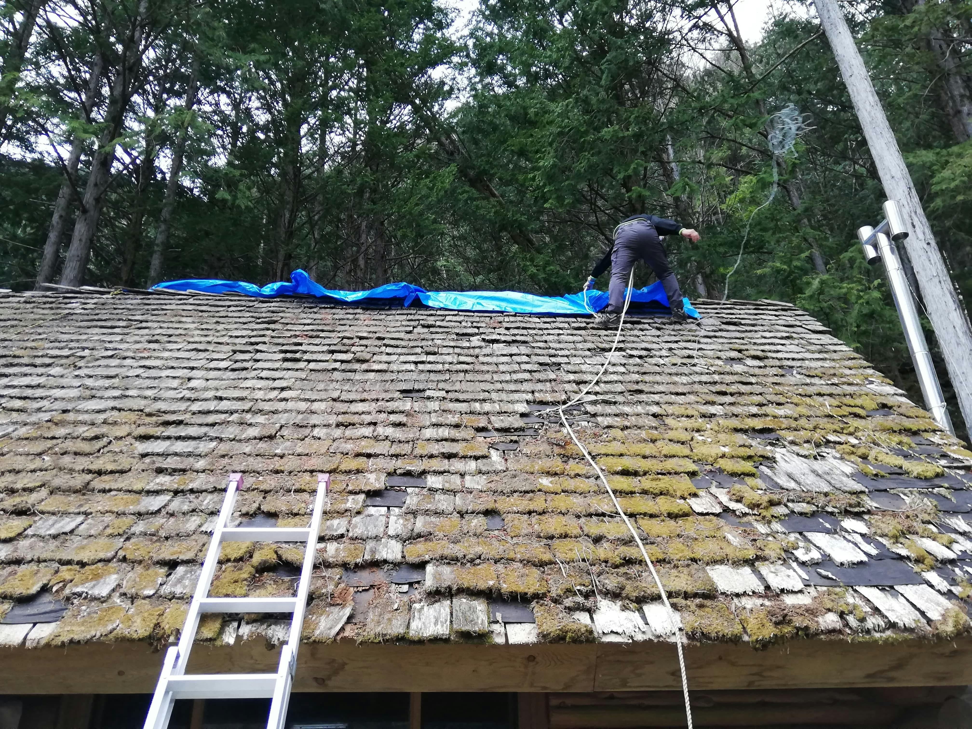 そこで、ログビルダーに屋根の倒木を下ろし、切ってもらいました。さらに屋根を専門家の方に見てもらうと、急勾配なので足場を作り、内部は高圧洗浄機でカビを除去する必要があるということがわかりました。