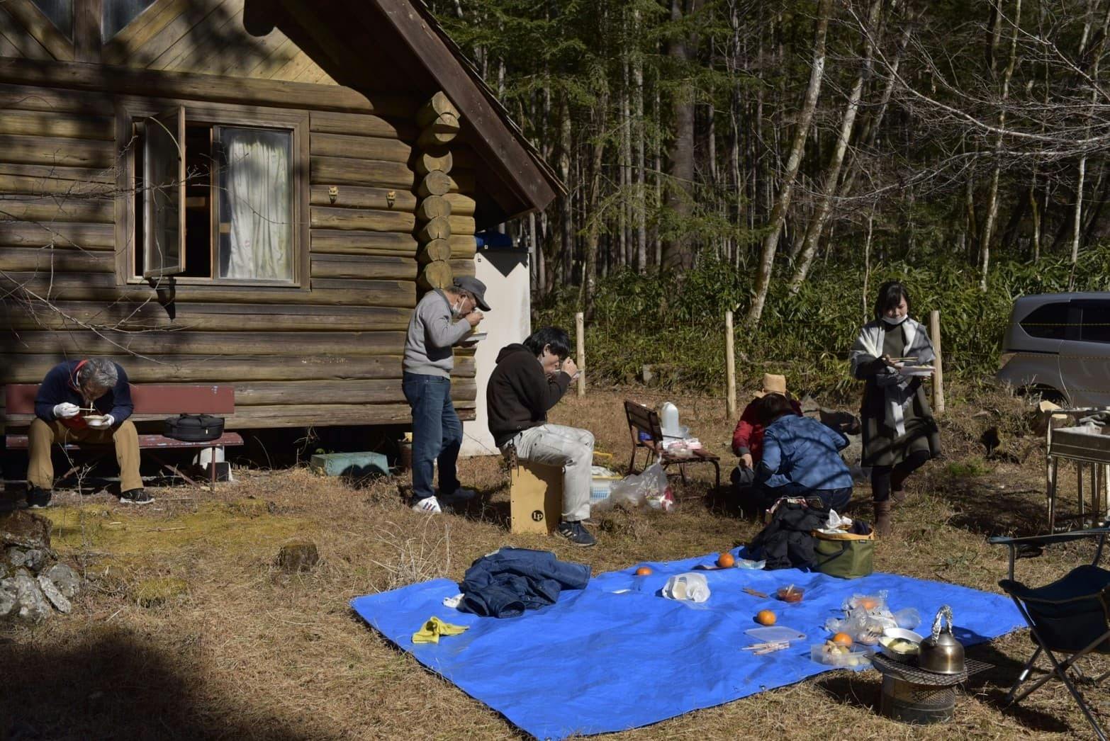 サクサク落ち葉を踏みしめ辺りを散策。空気が美味しく心穏やかで優しい気持ちになることを実感しました。ログの前にビニールシートを敷き、かまどに乗せた大鍋で作った豚汁を食べたり、ダッチオーブンで昼食を作り、七輪でチーズフォンデュをしたり、炭火で焼き芋を焼いたり、自然の中で食を堪能しました。さらに、思い思いの姿勢で環境のことや自然の話に話を咲かせました。