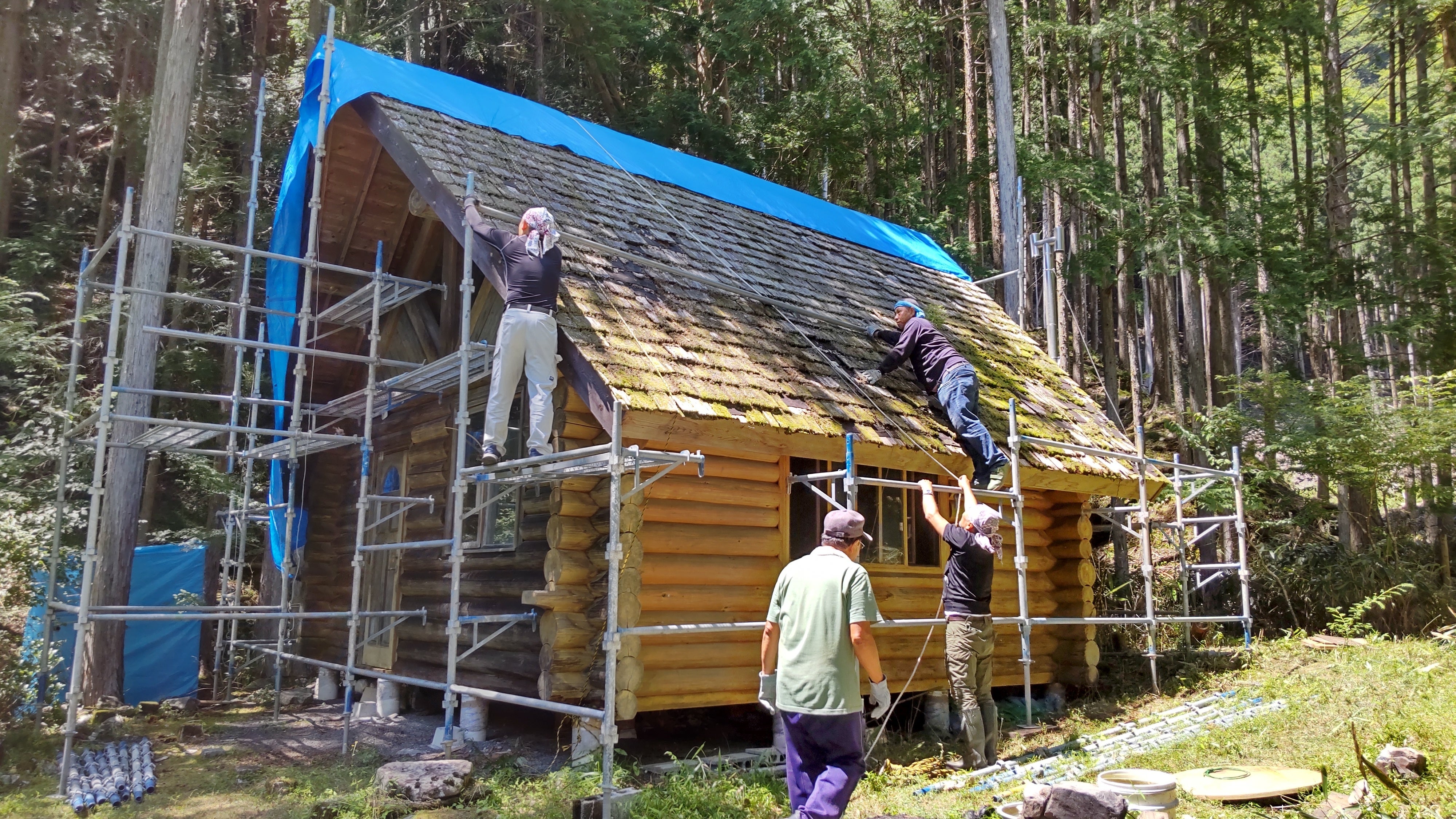 7月24日6人でログへ。山側の北向きの屋根は傷みが激しい。鱗状に組まれた板材、断熱材、防水シート等を男性陣が下に落とす女性陣は笹薮を切ったり、屋根材を集め、木片を竈でボンボン燃やす汗たらたら、しかし山の気温は下界より5度も低い、休憩時間、ランチタイムは風が快い、蝉の声、鳥の声しか聞こえない、疲れつつ、満足して3時帰路につきました