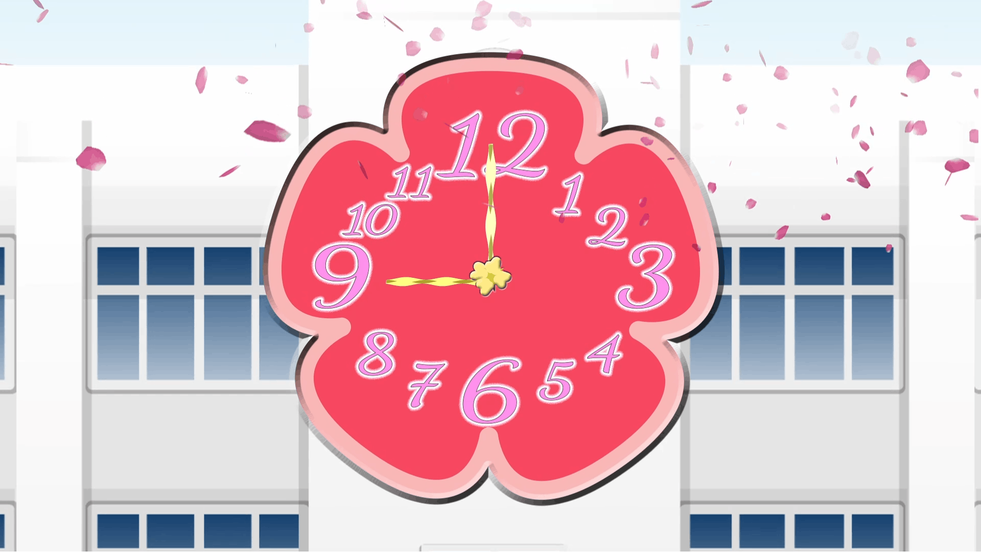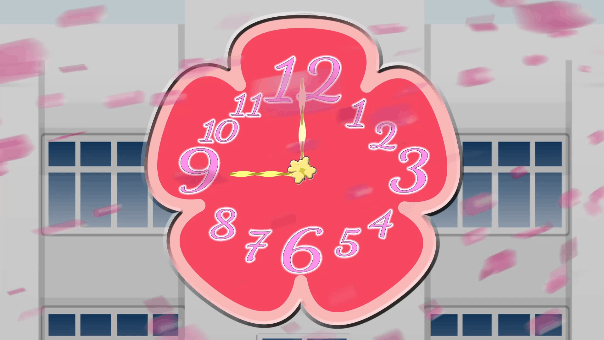 9時になり数秒後、学校のチャイムと同時に桜と風が吹きます。