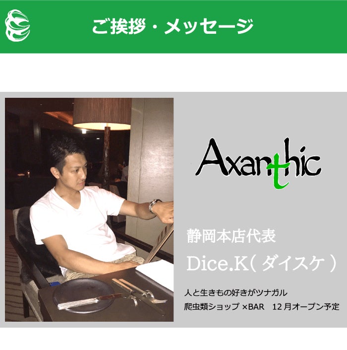 Axanthic(アザンティック)代表のDice.K(ダイスケ)と申します。