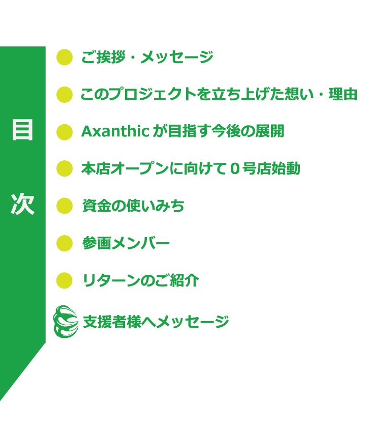 「ツナガル」をキーワードに、支援して良かったと感じていただけるショップを目指すためにも、トライアル店となるAxanthic埼玉0号店のご支援をぜひ!宜しくお願い申し上げます。