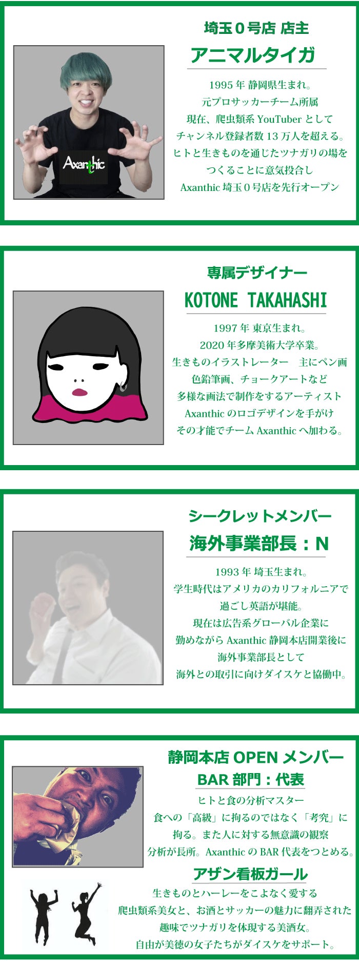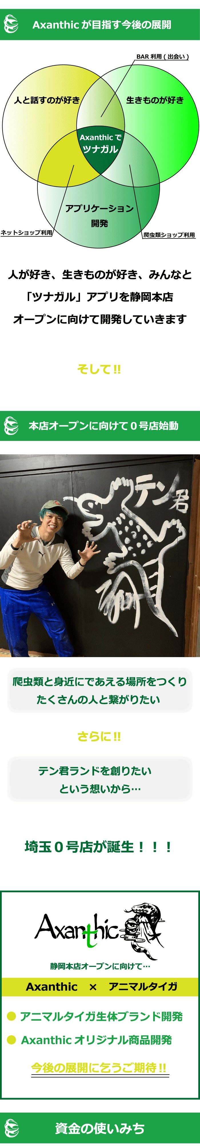 次のステップとして「爬虫類ショップ×BAR」Axanthic静岡本店をダイスケさんがオーナーとして開業を進めていく予定です!2店舗をひとつチームとして、本格的な活動を進めていくためにも、先ずは埼玉0号店の支援を皆様宜しくお願いします!
