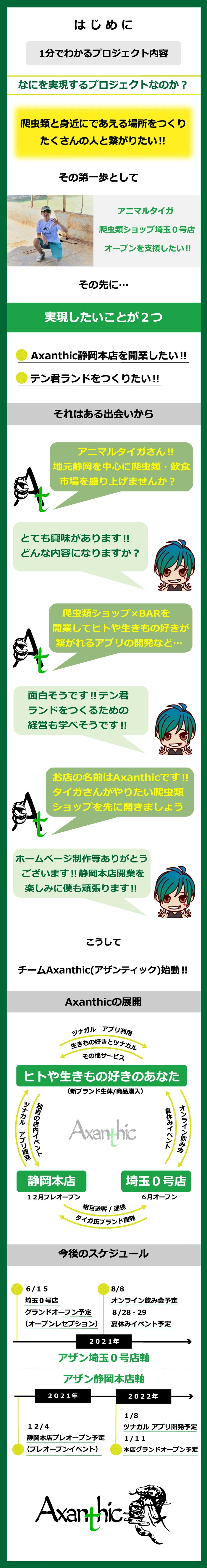 この正念場を乗り越えるため、Axanthicという「爬虫類ショップ×BAR」をつくり、将来的には埼玉・静岡を中心に「爬虫類」と「飲食」の市場を盛り上げたいと強い想いを抱くようになりクラウドファンディングを立ち上げました。