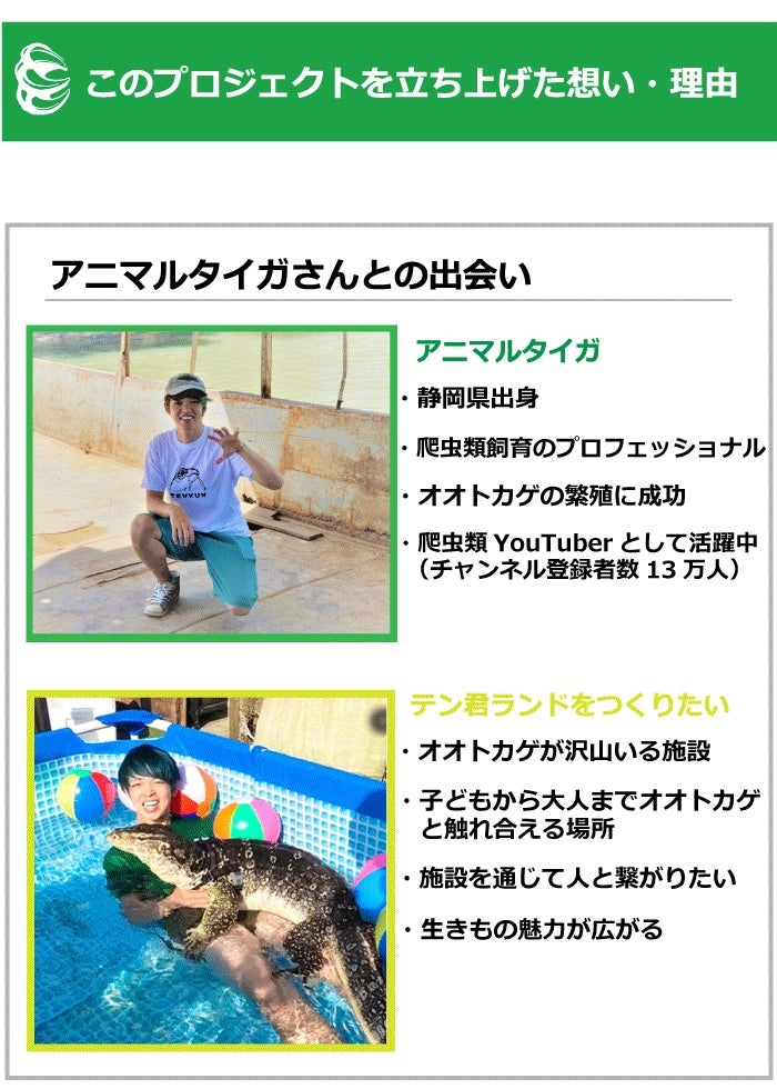 僕が10歳の頃から飼育しているミズオオトカゲの楽園「テン君ランド」をつくるのを目標に、日々動画を投稿しているなか、Dice.K(ダイスケ)さんという方に出会い、今回このプロジェクトを立ち上げることになりました!