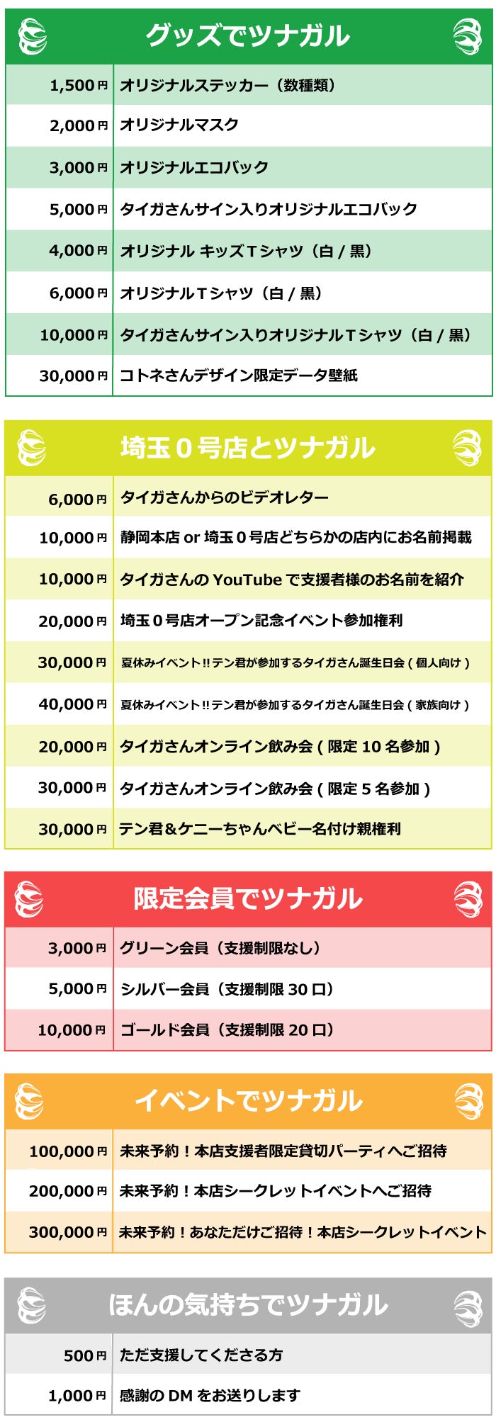 静岡本店が今後オープンしてからご利用可能な、お得な割引チケットや会員システムのリターンもご用意しておりますのでご理解の上、ご支援いただけたら幸いです。アニマルタイガさんとツナガルリターンに関しての「イベント」などはコロナウイルスの影響による緊急事態宣言の発令などで開催日が変更になる場合もございますので、あらかじめご了承下さい。