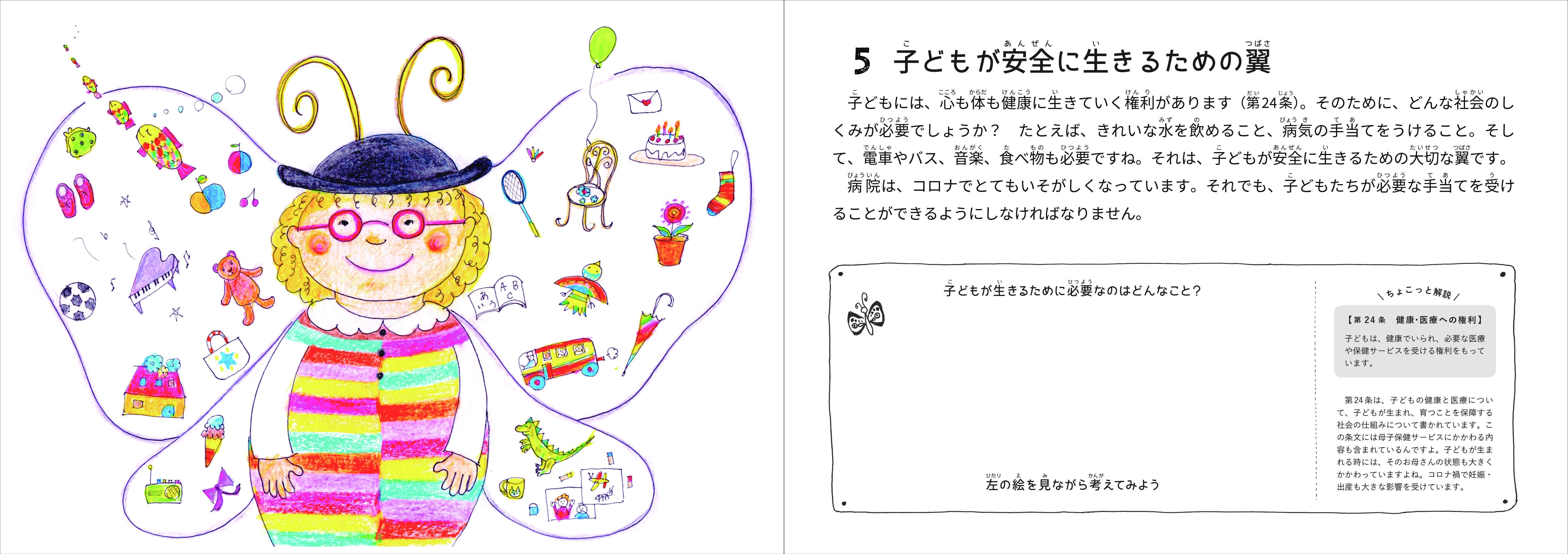 ワークブック型絵本の特徴のひとつめは、コロナ禍で奪われやすい子どもの権利を「やさしい日本語」で伝えているということです。当初は、「子どもにやさしい(child friendly)」ことを意識していましたが、「やさしい日本語」が阪神・淡路大震災で日本語を母語としない方に必要な情報が届かなかった反省のもとに生まれた、ユニバーサルデザインとしての表現であると知り、より多くの人にとってわかりやすい日本語という視点で、声明の言葉を再検討しました。また、項目のもとになっている権利条約の条文も紹介しています。子どもが感じている気もちや日常の出来事と、一見遠くに思われる子どもの権利はつながっています。子ども自身が大切な存在で、その大切さには根拠があることを伝えたいと考えました。