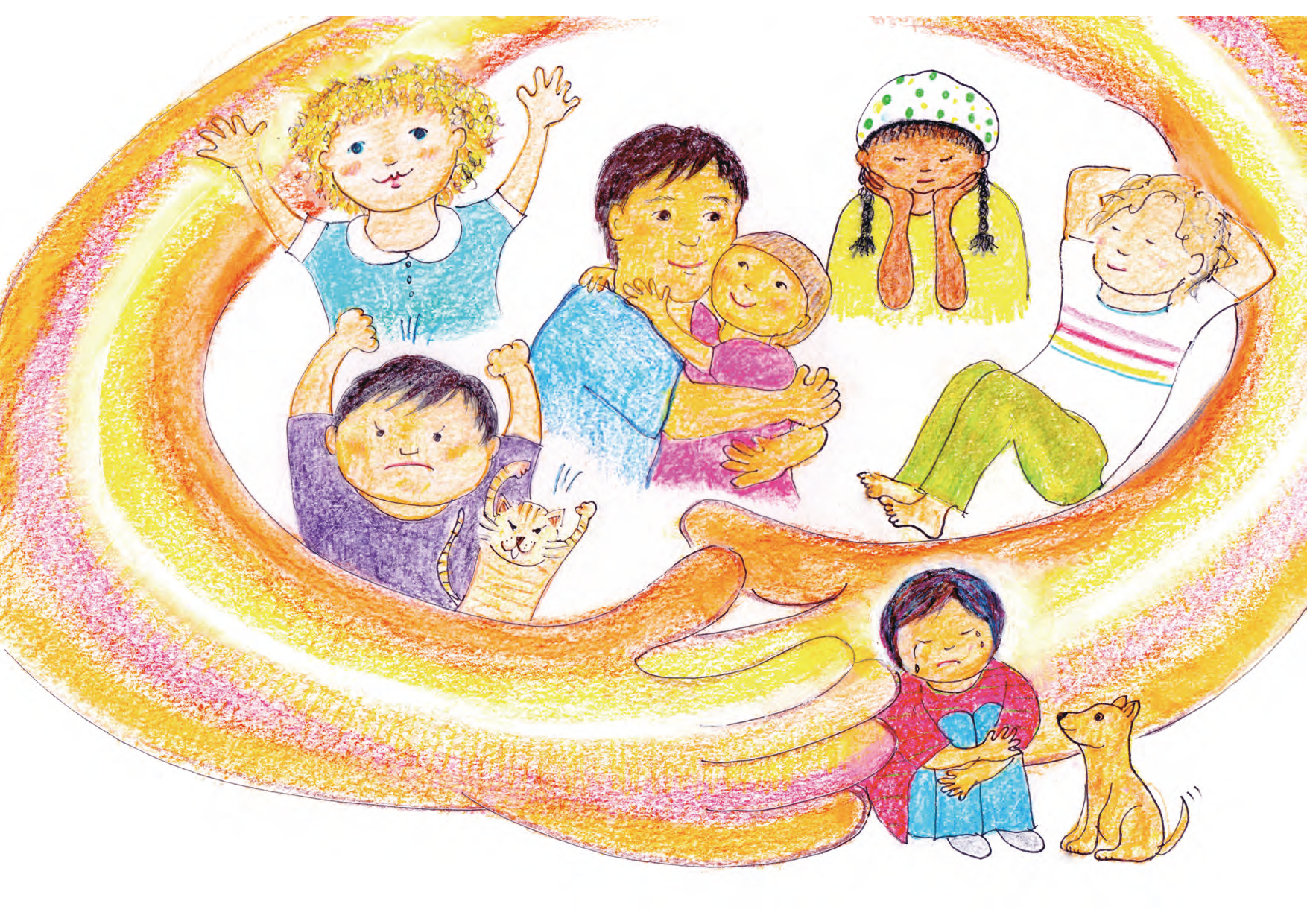 ④ 全編、色鉛筆による優しい手描きイラスト