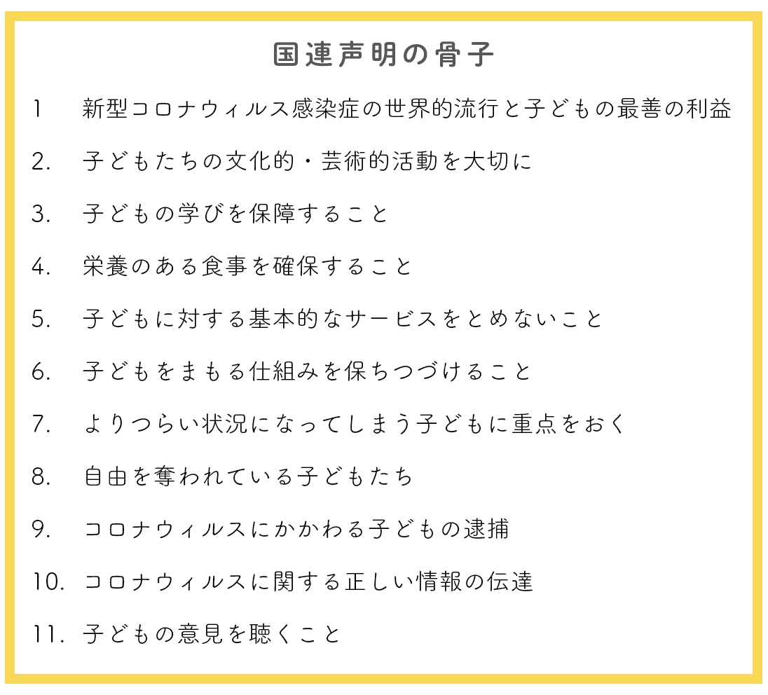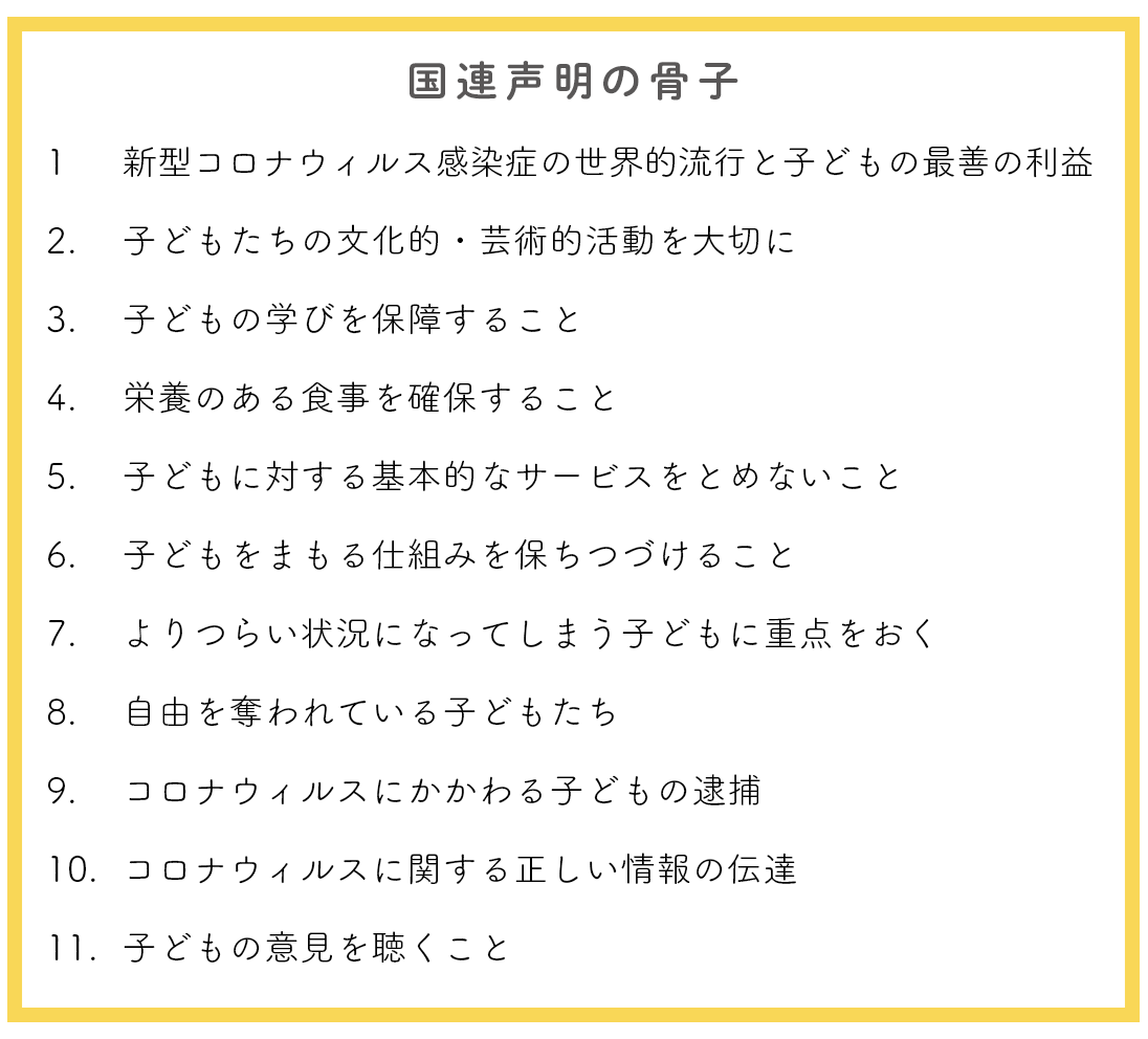 コロナ禍において、国連子どもの権利委員会が出した声明があります。子どもたちのために、「国が」どのようなことを考え、守っていかなければならないかをまとめたものです。