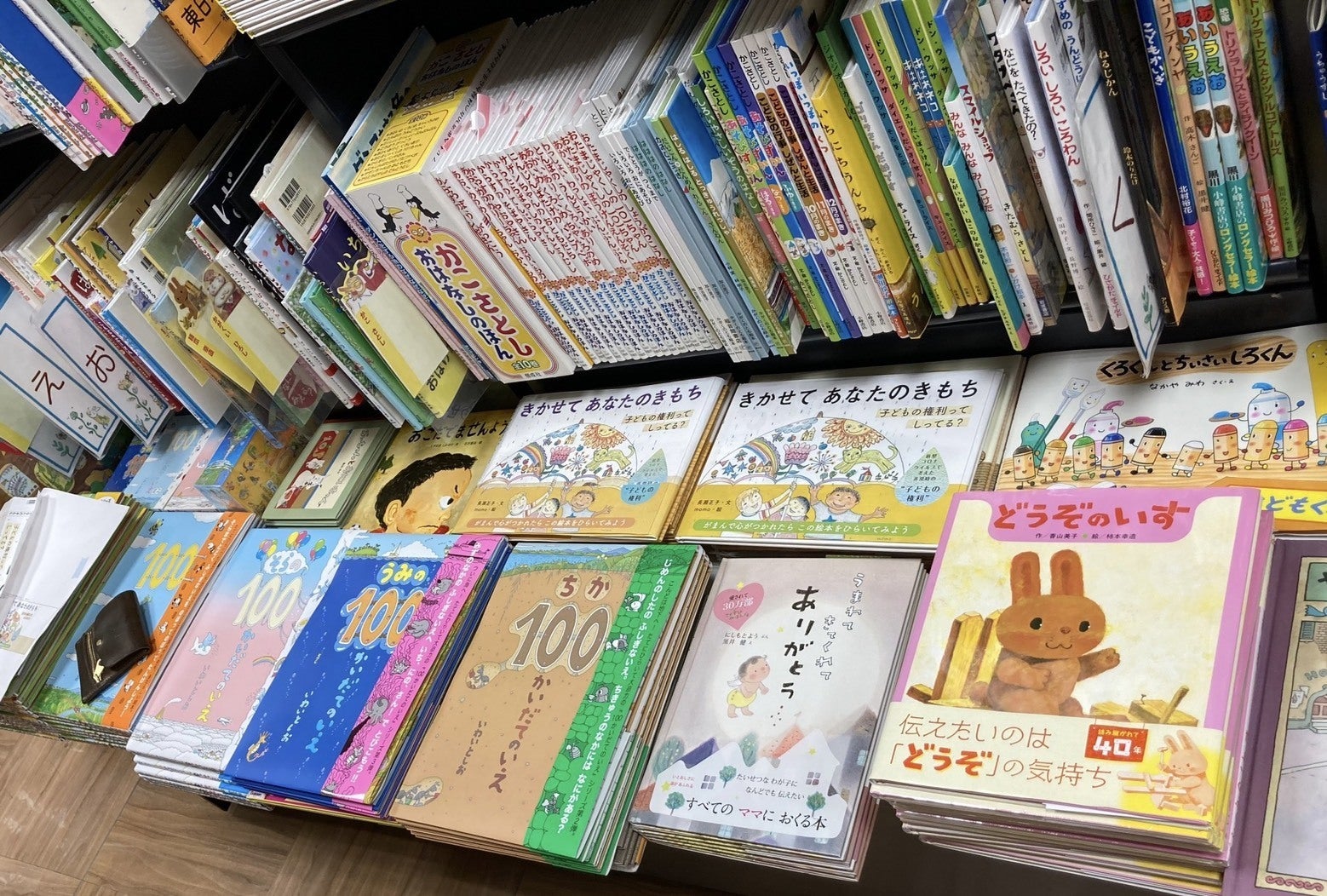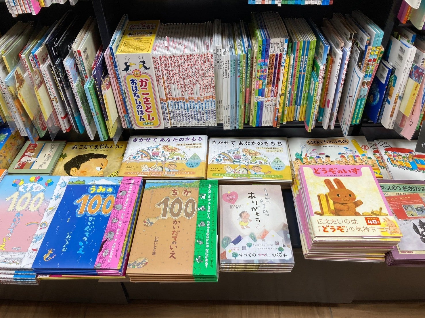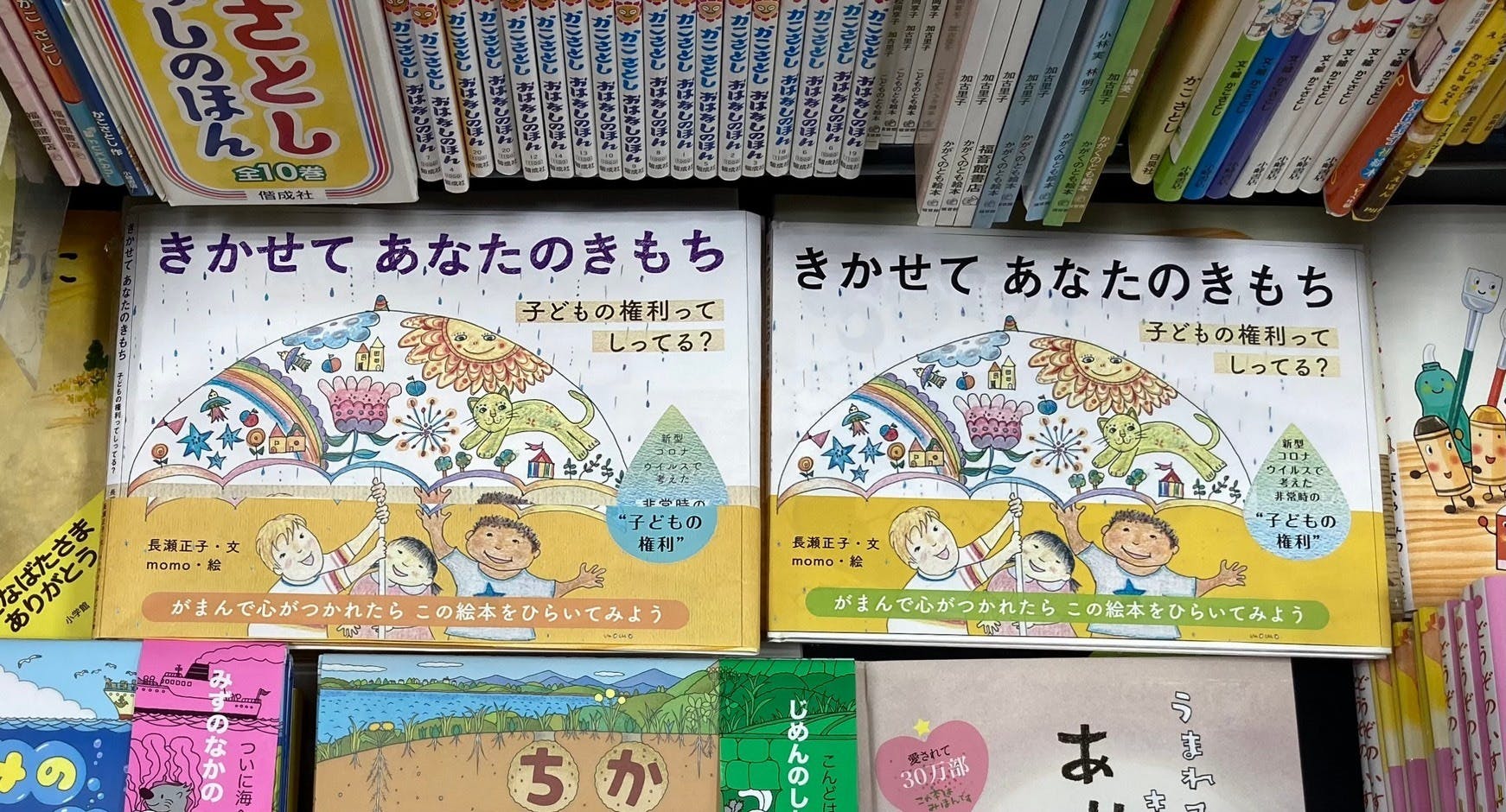 絵本コーナーの中にも、知育ものや翻訳ものなどさまざまなジャンルがあるので、今回の絵本と分野が似ている絵本の近くに置いてみて、いろんな角度から眺めてみます。