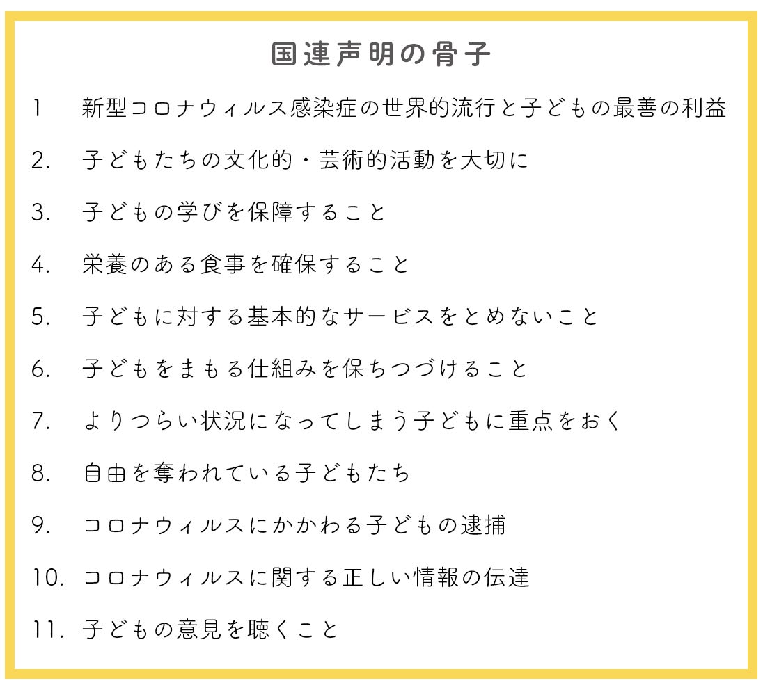 コロナ禍において、国連子どもの権利委員会が出した声明があります。子どもたちのために、「国が」どのようなことを考え、守っていかなければならないかをまとめたものです。