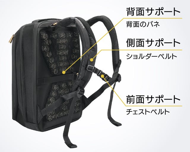 ショルダーベルトに集中する負荷をバックパック全体に分散。肩だけで荷物を支える構造から体全体で支える構造に大きく変化しました。