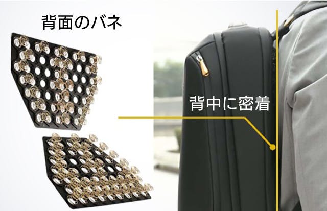 背面に62個のスプリングを配置。バックパックが背中にフィット。前後の揺れを抑えるので余分な力がかからず軽くなります。