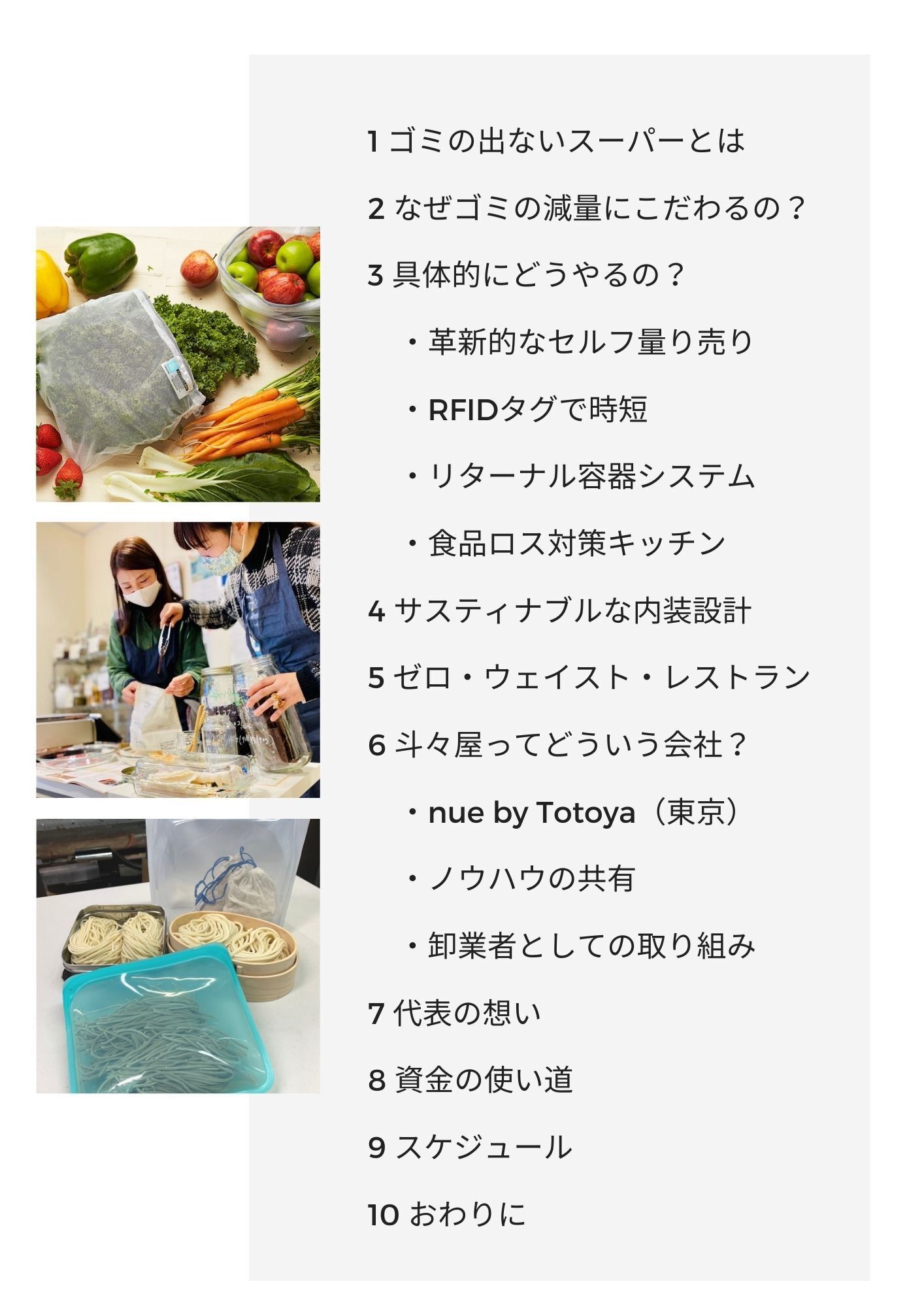 実は、ゼロウェイスト・スーパー斗々屋の構想は、3年前に出来上がっていたんです。当時はこれをなんとか実現させようと、あちこち必死に練り歩き回ったものの、なかなか共感してもらえず、月日が経ちました。ですが、この3年の間に素晴らしい仲間ができて、ようやく、3年前に一人ではチャレンジできなかったアイディアを、何倍も、何十倍も素晴らしくなった形で実現できることになりました!