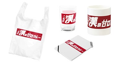 完成した漢の甘口カレーを5個と漢の甘口カレーロゴ入りグラス、エコバッグ、ノート、マグカップ、サンダル、テーマソング「カラクチゼツメツ大作戦」田村潤奈サイン付きCDをセットでお届けします。