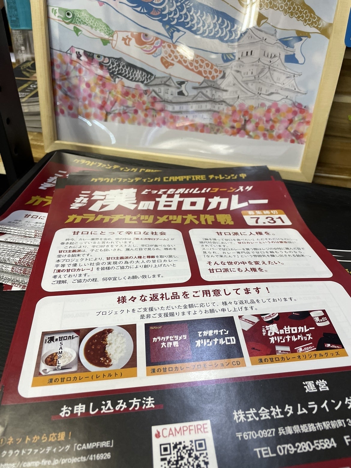 の店内にて【これぞ!漢の甘口カレー】のクラウドファンディング申し込み書を置いています!