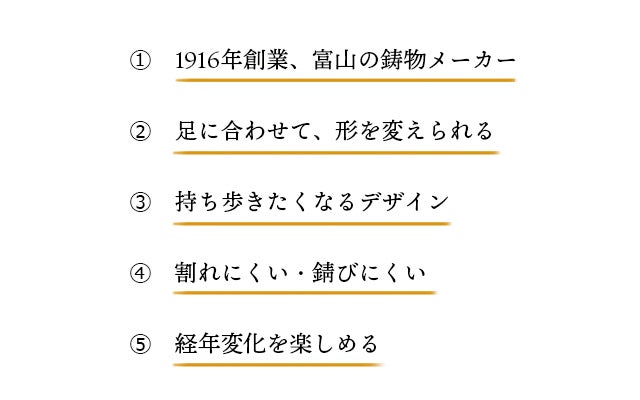 全て国産で、一つ一つが伝統の「高岡銅器」の技法を受け継ぐ職人による手作りです。鋳物の本来の味と温もりを肌で感じていただけると思います。
