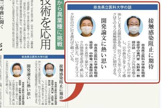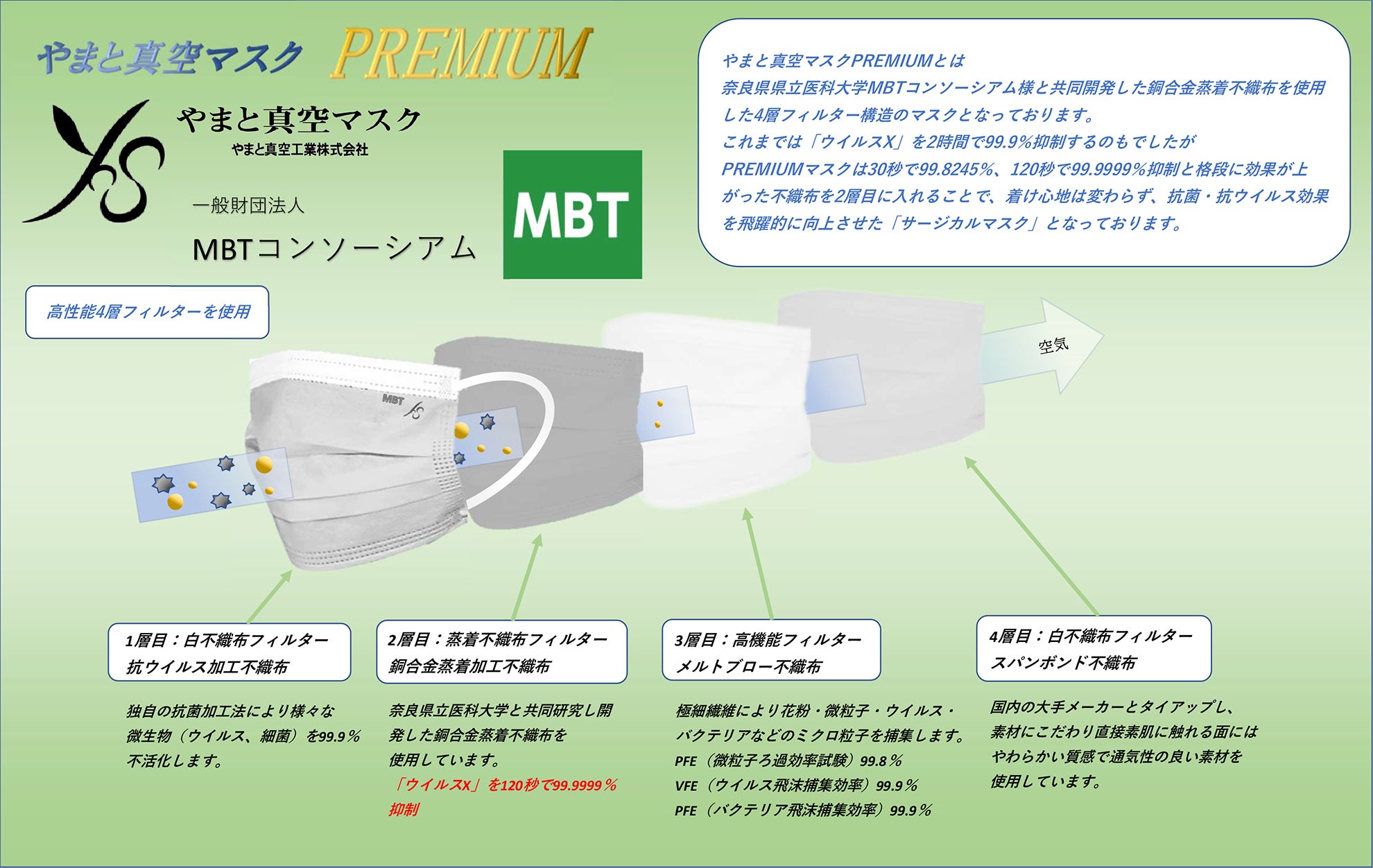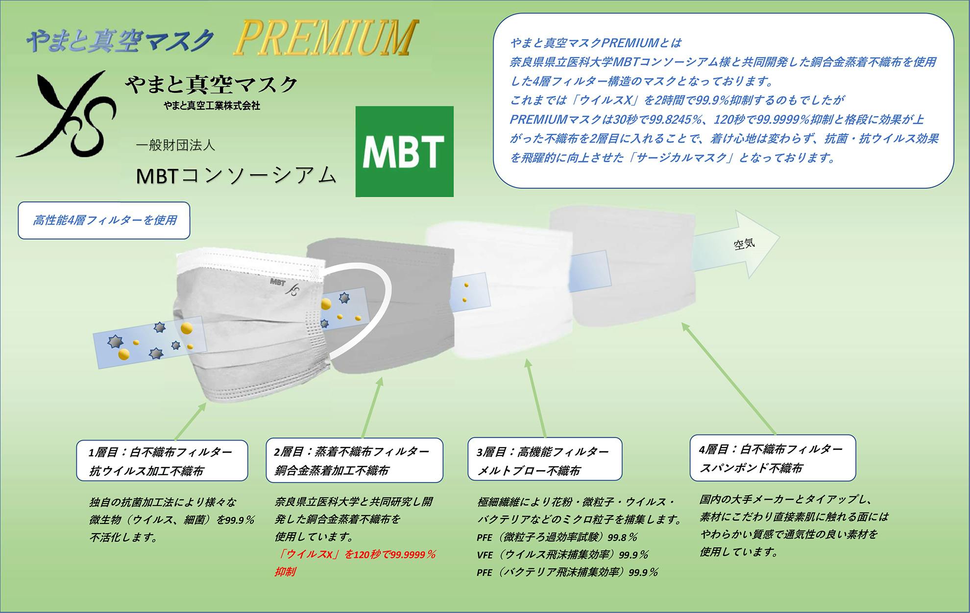 この度、弊社の技術をさらに応用し、奈良県県立医科大学MBTコンソーシアム様と共同開発した銅合金蒸着不織布を使用した4層フィルター構造のマスク「やまと真空マスクPREMIUM」を開発いたしました。
