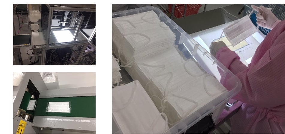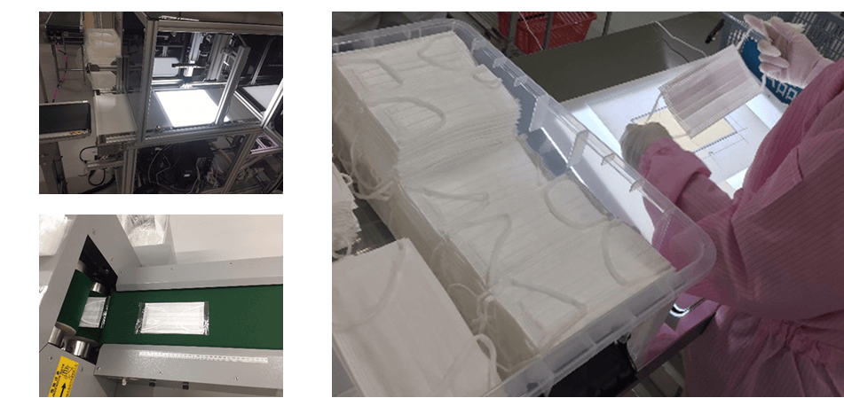 品質管理体制も徹底。画像センサーによって成型のズレや汚れ、異物混入がないかを、1枚1枚マスクの両面からスキャンし検査します。検査員は全員、自社基準に基づき、マスクの汚れ、キズ、色調、エンボスのズレなどをシーリングライトにかざして裏表両方確認します。耳紐部分も同じように規格内の寸法なのか、マスクの四隅に耳紐が定められた一に密着されているかを1枚1枚徹底的に検査し、包装済み製品の最終検査を行い箱詰め作業をしていきます。画像センサー・検査員により3回検査を行い、品質の管理を徹底しています。