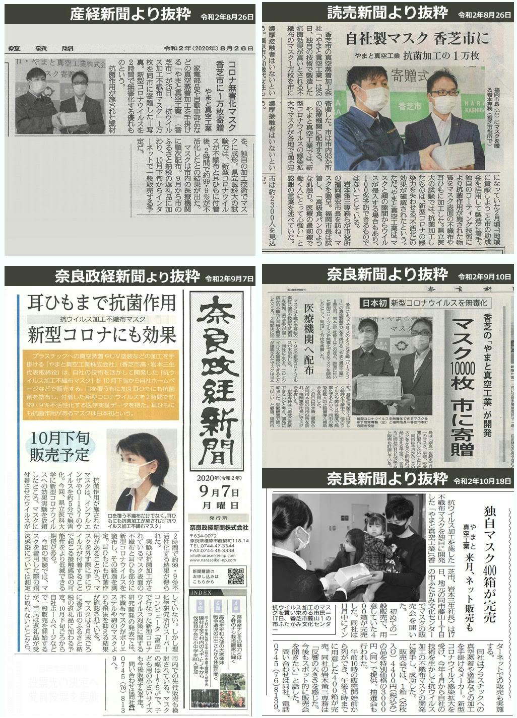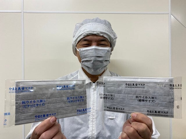 長期間続いているコロナ禍において、弊社の真空蒸着の技術がウィルス対策に生かせることがわかり、特使とした技術を少しでも社会のお役にたてたいと、昨年度よりマスク製造を開始し、2020年には、先駆けとなる「やまと真空マスク」を開発。そして、製造・販売だけでなく、市町村や団体への寄付活動などを行ってまいりました。