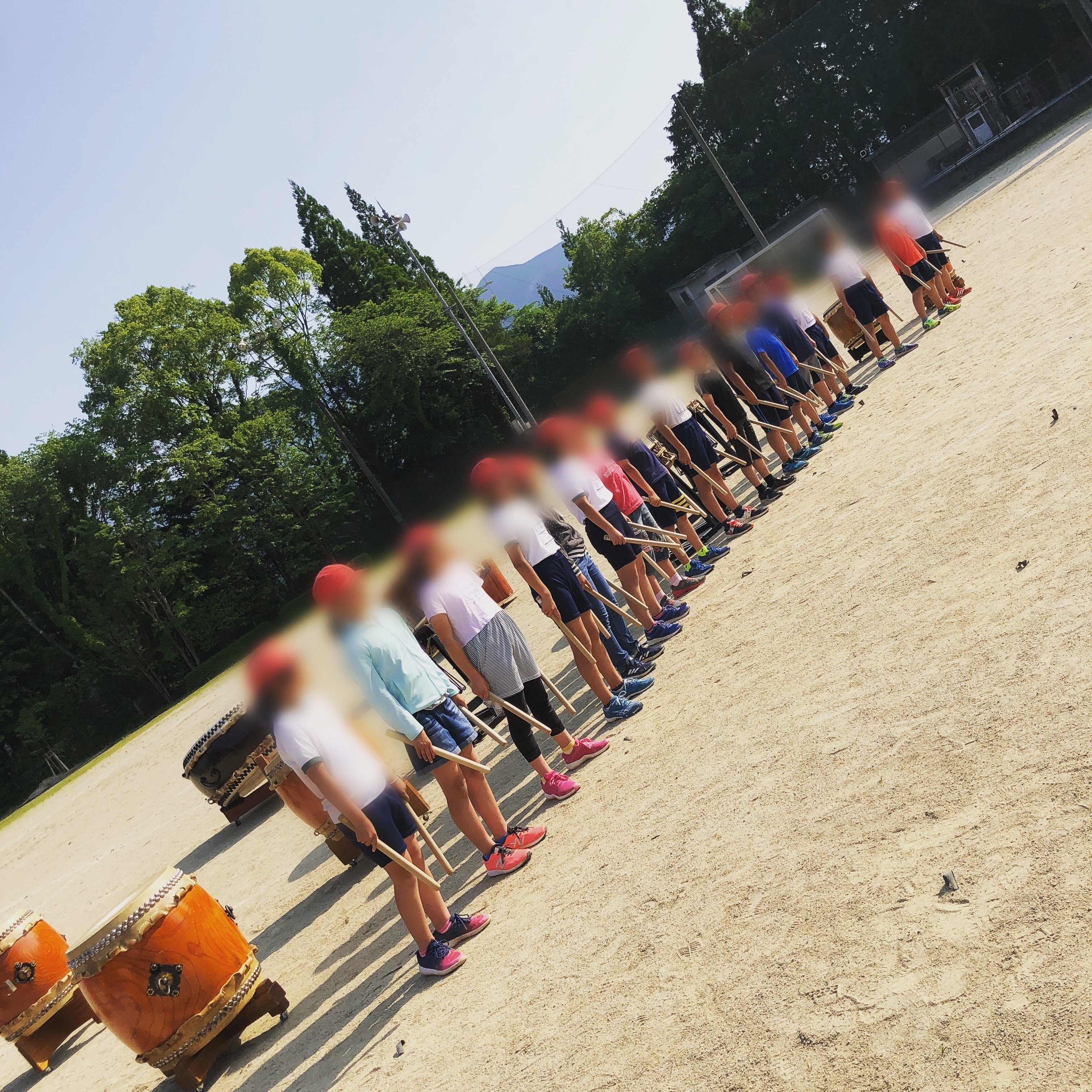 先生方が走り回り、学校近くの車屋さんで古タイヤ譲り受け、夏休み期間中にせっせとガムテを張り、おなじく近所の大工さんに組み立て式の太鼓台を作っていただき、バチは生徒達が自ら削り出し。。。