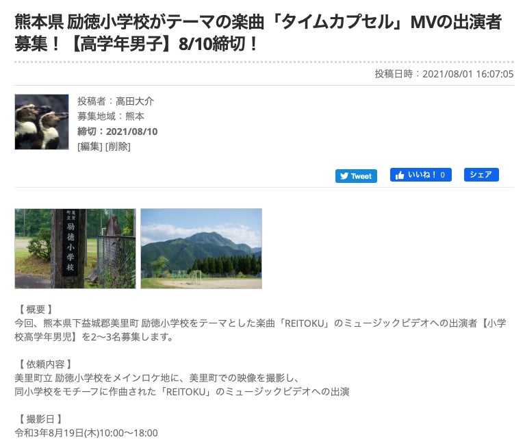 このMVに出演してもらう子役(男の子)を探すため、キャスト募集サイトに投稿しました。