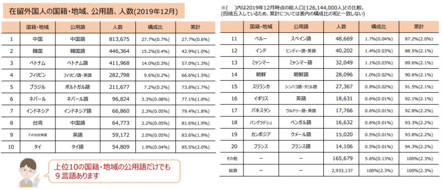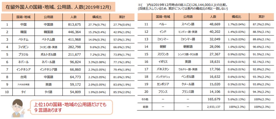 日本に住む外国人で人数の多い国TOP20のうち、英語を公用語としている国は2か国のみです。
