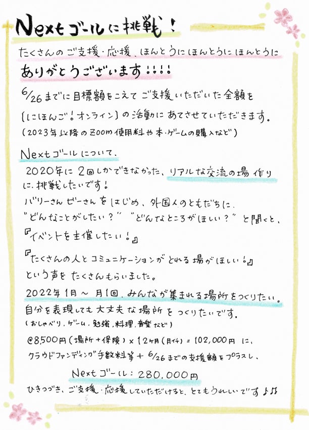 もし、目標額を上回るご支援をいただいた場合は、〔にほんご!オンライン〕をより楽しい場にしていく為の、ゲームや本などの購入費用に充てさせていただきます。