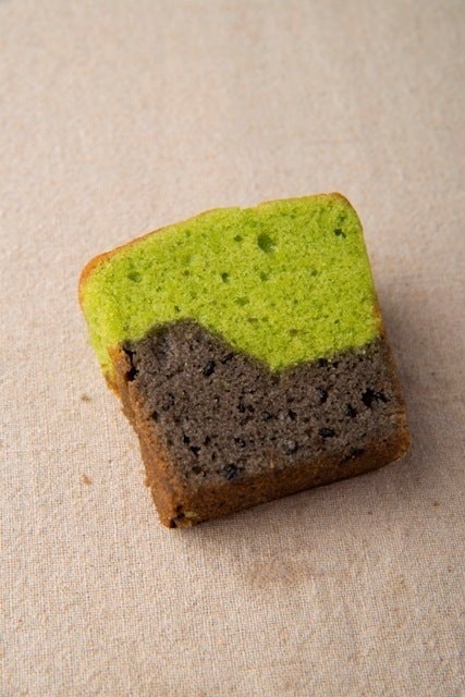 ジェノワーズ(スポンジ)が緑色なのは、ホウレンソウの色です。