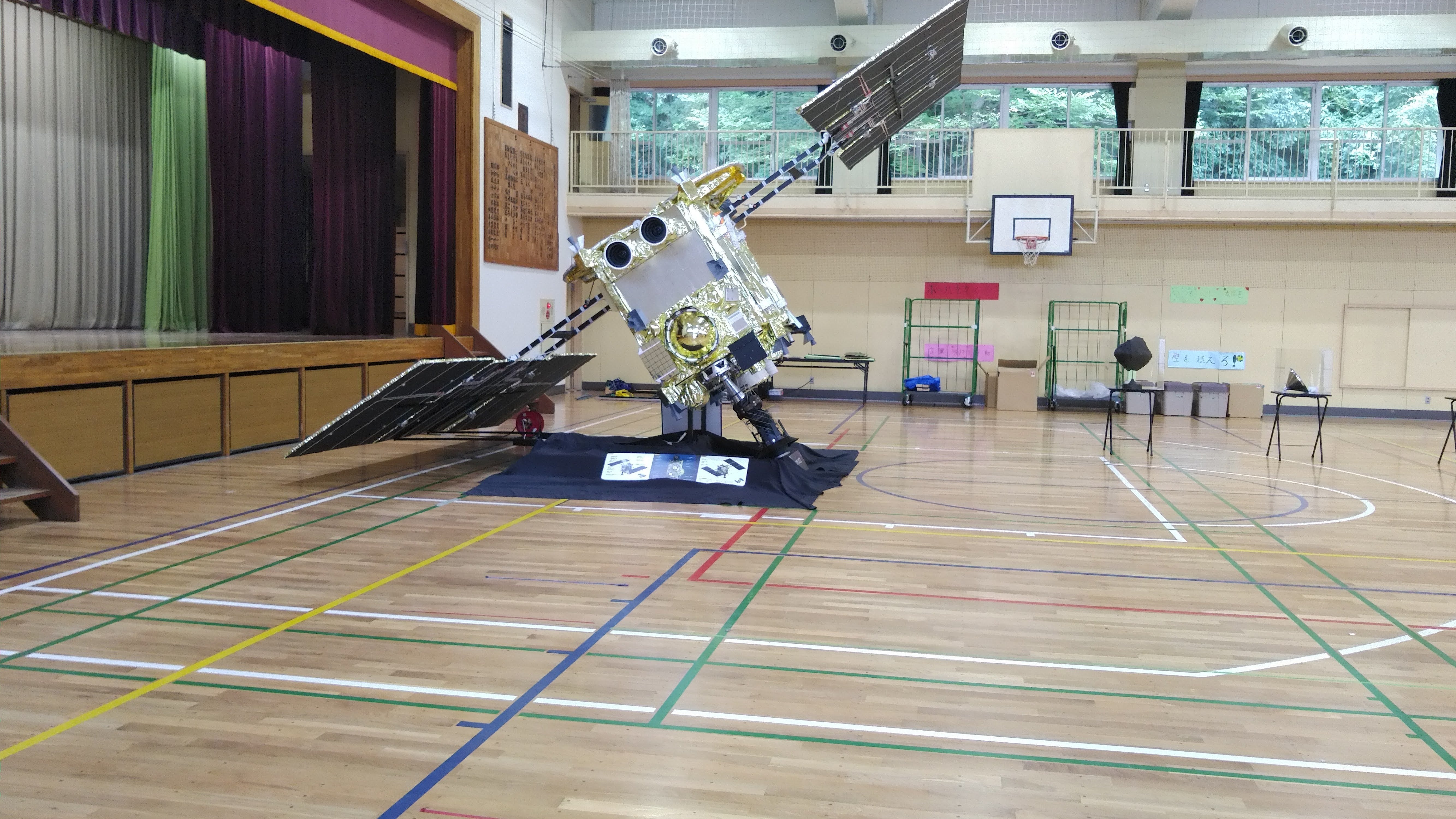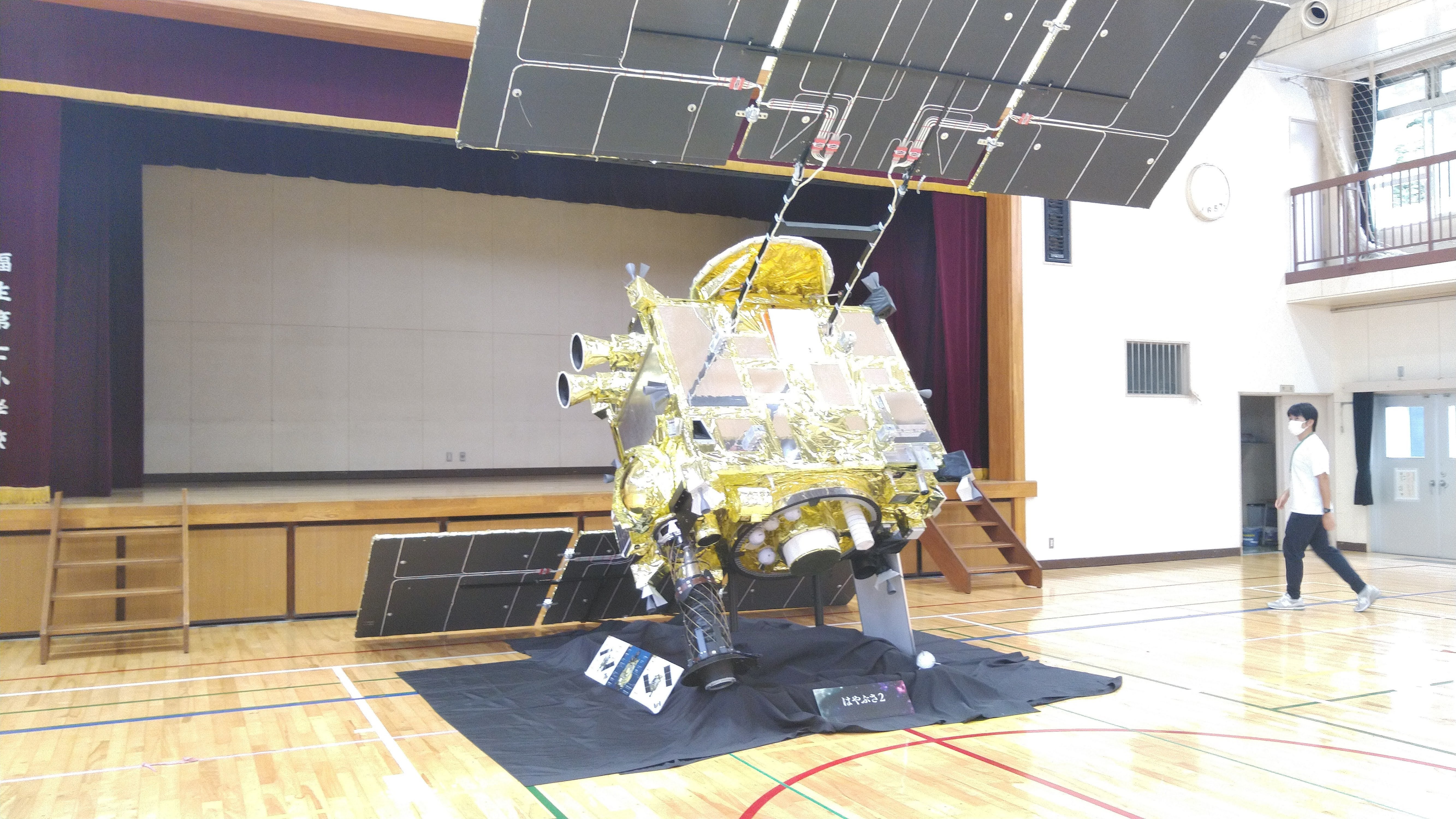 今日は福生第七小学校で展示をしてきました。一計を案じまして、模型を舞台そばに配置したんですね。舞台を上がると、「はやぶさ2」の上面がよく見えるという寸法です。大きな探査機を上から見下ろすことができて、みんな大興奮でした。他の学校でもこんな感じで展示したいと思います。さて、小学生はみんな元気ですね。特に低学年の子達は、いろんな質問をぶつけてきてくれました。その熱気に、私がたじたじとする場面も。また高学年の子達は、非常に熱心に話を聞いてくれました。その後の自由観察の時間も興味深そうにいろいろ見ていましたね。今日多かった質問は、「なぜ金色?」でした。これは、オレンジ色の「ポリイミド」フィルムに銀色のアルミニウムを蒸着すると、金色になるからです。このフィルムを十層以上重ねて断熱材にしています。このおかげで、マイナス150度からプラス120度にもなる宇宙空間でも内部の機械を保護することができます。明日は福生第五小学校です。どんな質問が飛び出すか、今から楽しみにしています。