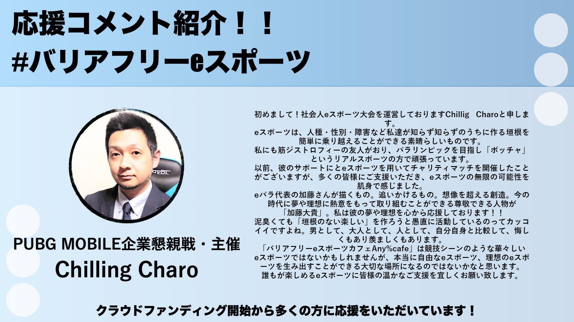 「初めまして!社会人eスポーツ大会を運営しておりますChillig Charoと申します。