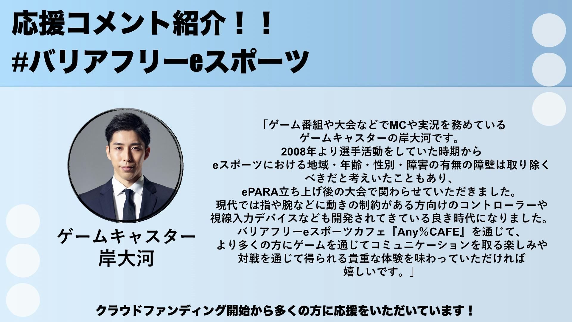 ゲームキャスターとしてご活躍をされている岸大河さんより、応援メッセージをいただきました!!