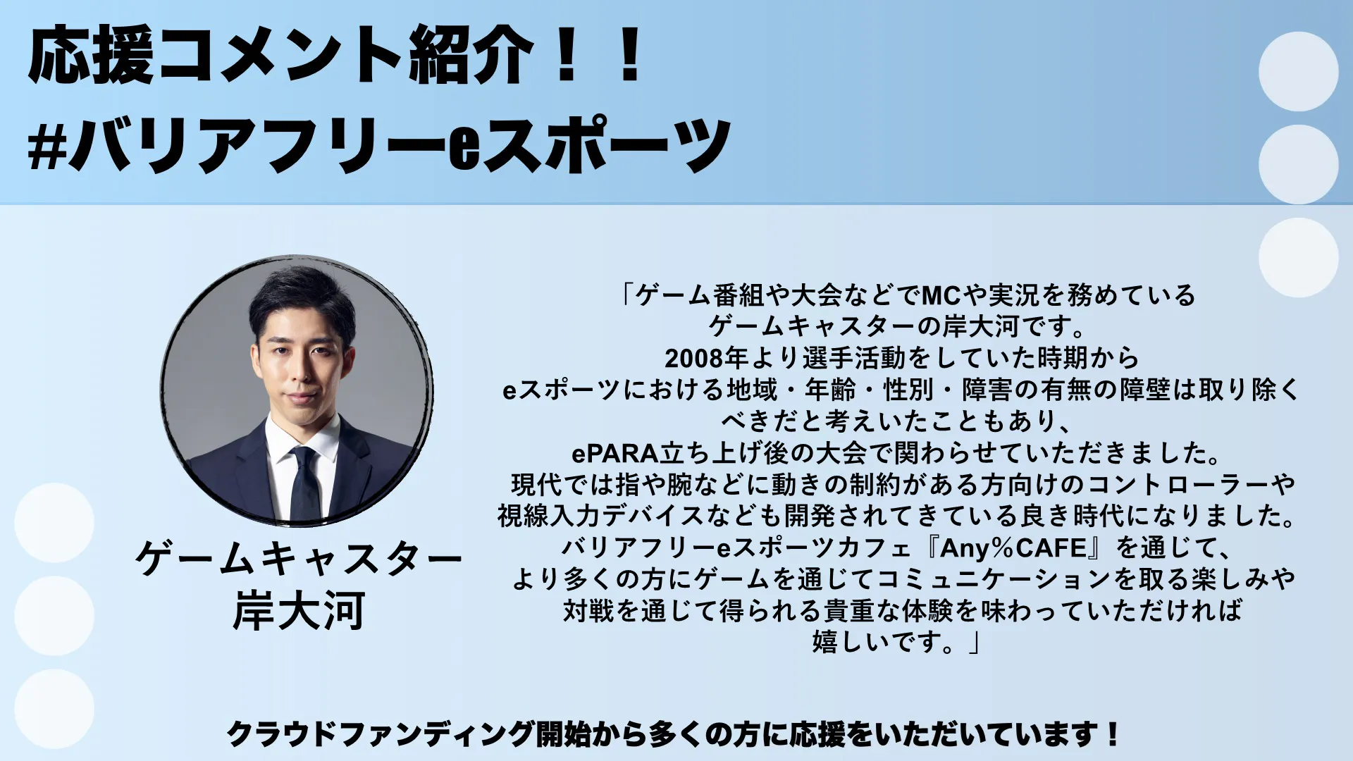 バリアフリーeスポーツカフェ『Any%CAFE』を通じて、より多くの方にゲームを通じてコミュニケーションを取る楽しみや対戦を通じて得られる貴重な体験を味わっていただければ嬉しいです。」