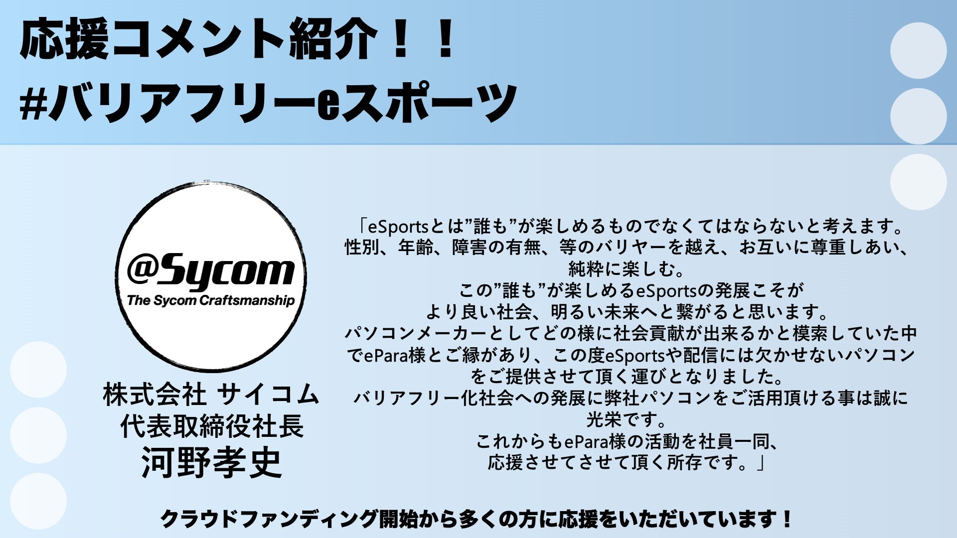 「eSportsとは”誰も”が楽しめるものでなくてはならないと考えます。性別、年齢、障害の有無、等のバリヤーを越え、お互いに尊重しあい、純粋に楽しむ。この”誰も”が楽しめるeSportsの発展こそがより良い社会、明るい未来へと繋がると思います。パソコンメーカーとしてどの様に社会貢献が出来るかと模索していた中でePara様とご縁があり、この度eSportsや配信には欠かせないパソコンをご提供させて頂く運びとなりました。バリアフリー化社会への発展に弊社パソコンをご活用頂ける事は誠に光栄です。これからもePara様の活動を社員一同、応援させてさせて頂く所存です。」