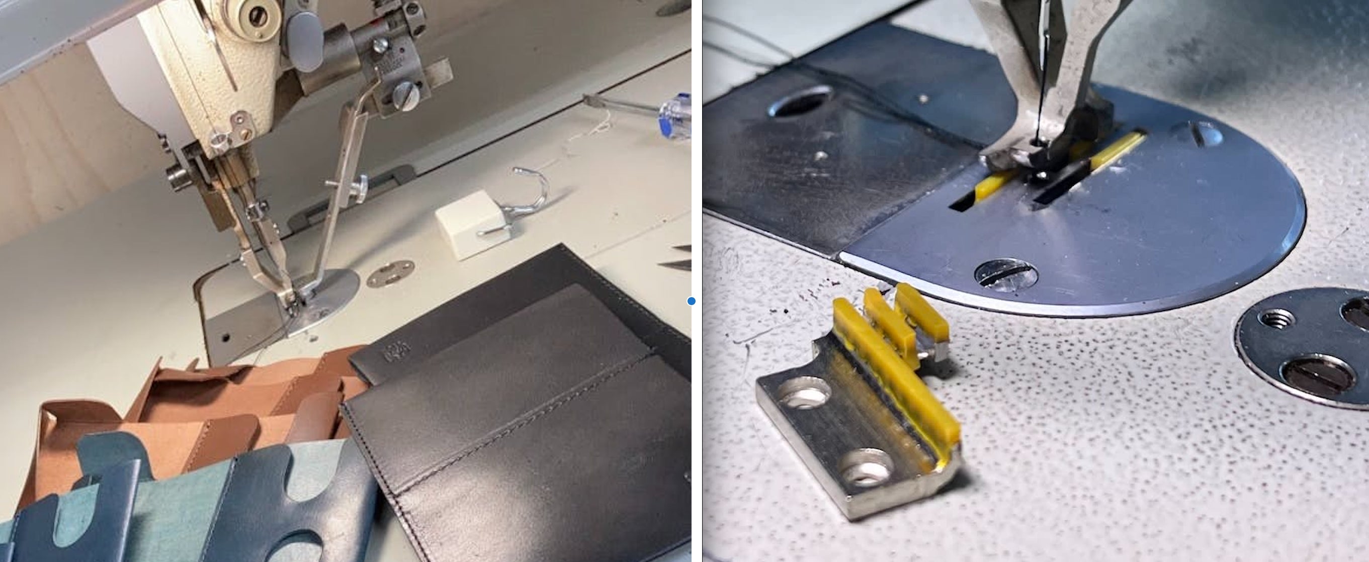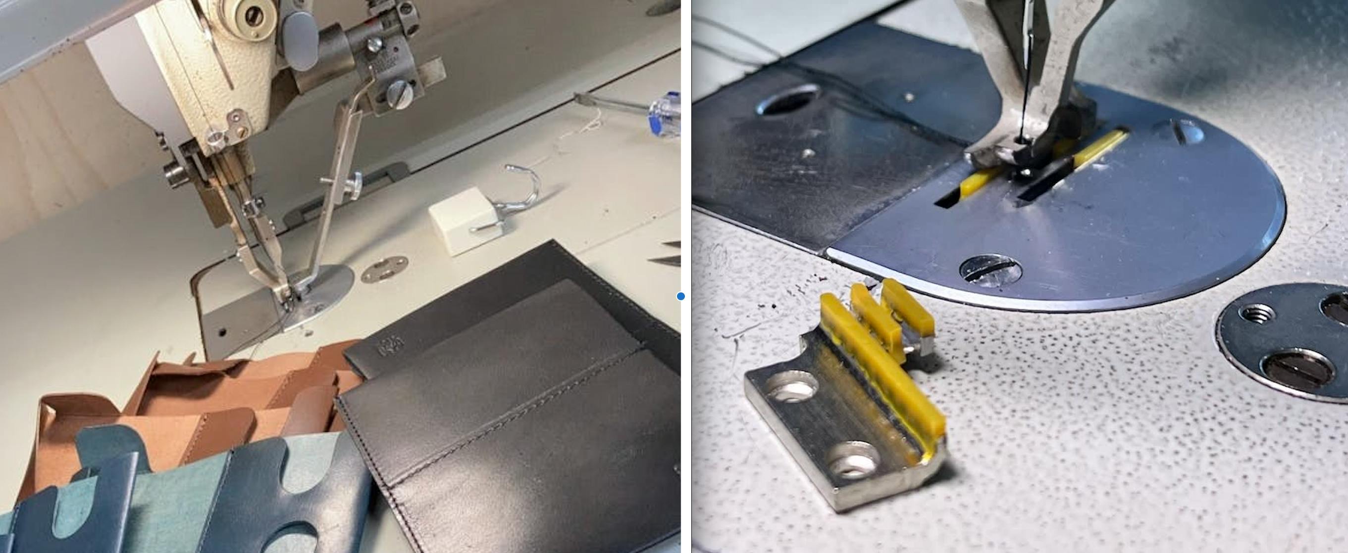 Slide Thumbのような薄い革の仕立ては、通常とは勝手が違うため、革に縫製跡がつかないようミシンにゴム送りを使っていただくなど、細部までご配慮をいただいています。