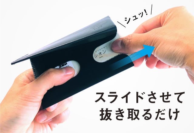 閉じたスライドサムの間に親指を挿し入れて、切り込みに沿って指をスライドさせれば、サッと名刺を取り出せます。