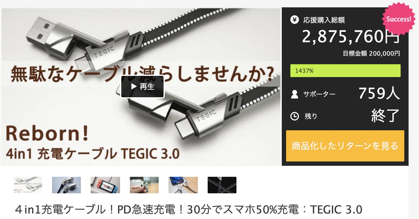2021/07/15 11:55サポーターみなさまいつもご支援ありがとうございます!お陰様で目標達成することができました。心より御礼申し上げます。https://camp-fire.jp/projects/view/417251引き続き告知活動に注力してまいります。みなさまの知人・ご友人の方々にもシェア拡散していただけますと幸いです。最後まで宜しくお願い致します。4in1充電ケーブル『TEGIC Steelix』プロジェクトスタッフ一同 もっと見る