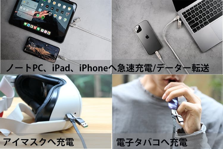 何本もの変換ケーブルを持ち歩く手間が省けます。iPhone、iPad、Androidスマホ、Macbook Pro、モバイルバッテリーなど、これ1本で様々な電子機器に対応します。