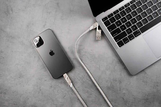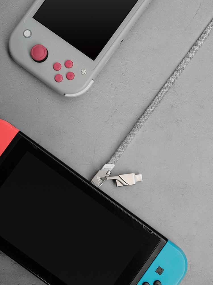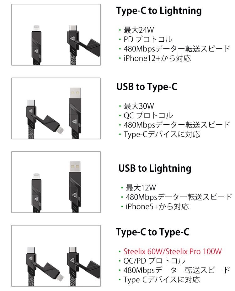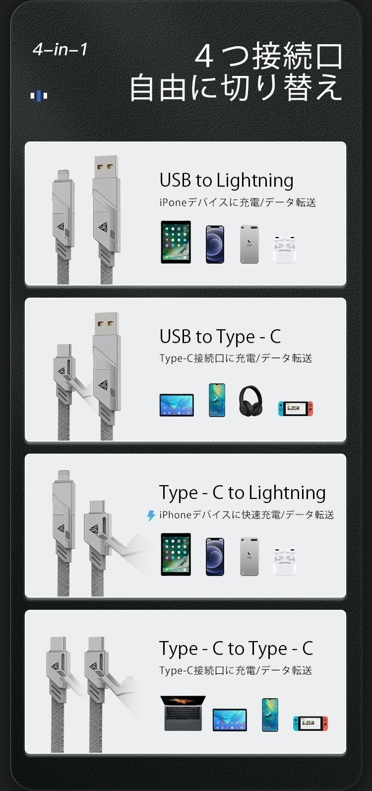 Type-C同士を接続するType-C to Type-Cのケーブルをベースに、両端に取り付けられたUSBとLightningの接続ポートを組み合わせて使用します。パターンは4種類で「Type-C to Lightning」「USB to Type-C」「USB to Lightning」「Type-C to Type-C」の充電やデータ転送をサポート。