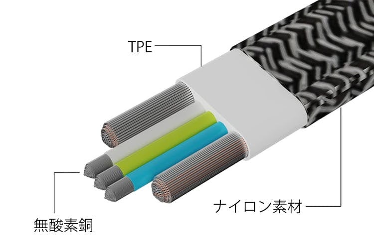 接続ポートとケーブルは丈夫で耐衝撃性の高い亜鉛合金製。断線に強く、耐久性に優れたつくりとなっております。平たいケーブルの表面はPVCナイロン編みで覆われ、頑丈さと絡まりにくい柔らかさを両立しました。優れた素材を組み合わせることで、断線ZEROを目指します。