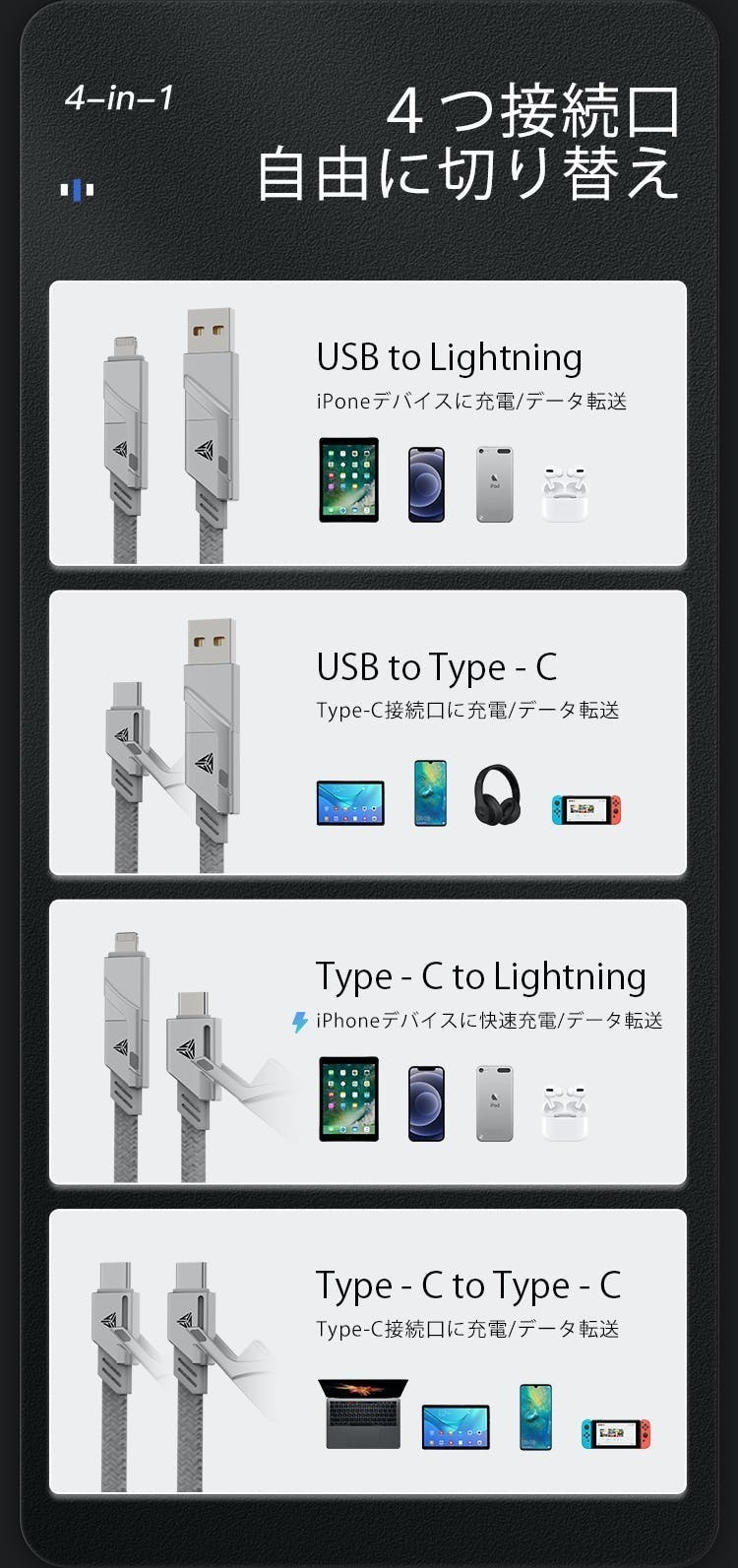 最大4.5A、100W 充電| 480Mbpsデータ転送スピードの4in1の超多用途の充電&データ転送ケーブルです。