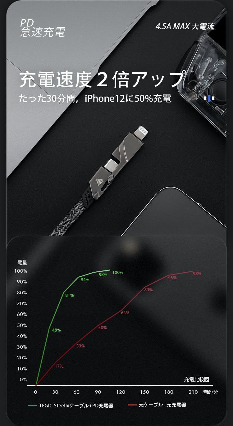 最大4.5A出力大電流でたった30分間, iPhone12に50%充電できます。