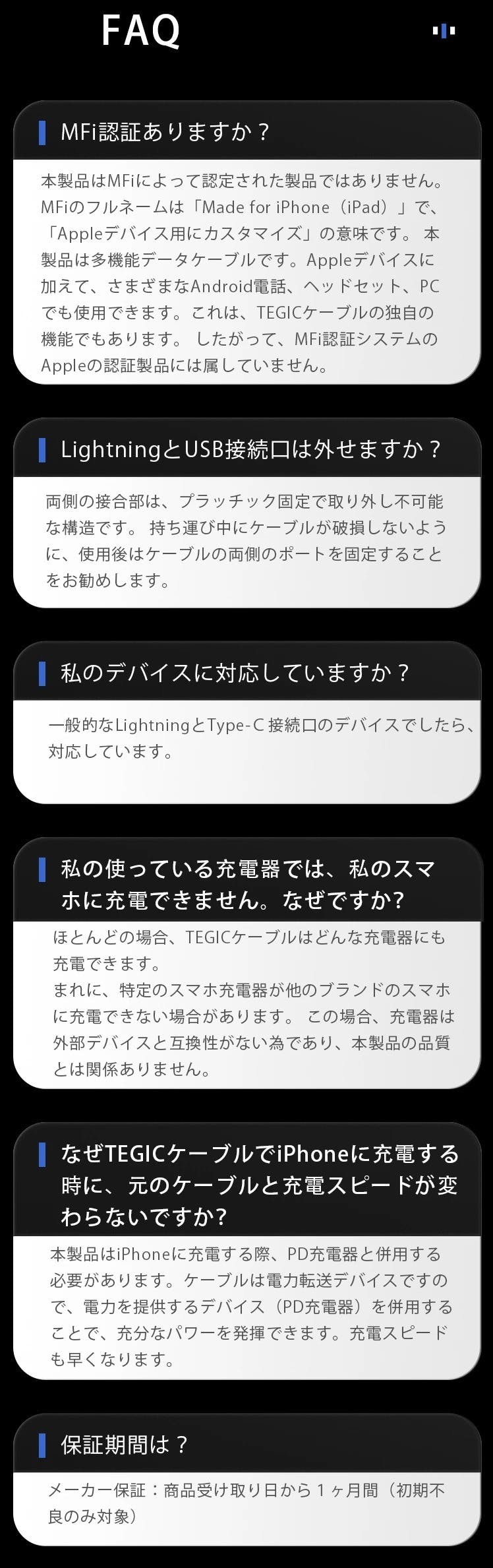 私たちはケーブルを充電するために「ユーザーの習慣を変えない解決策」を開発することにしました。それがTEGIC『4in1充電ケーブル』です。Type-C to Lightning、USB to Type-C、USB to Lightning、Type-C to Type-Cまでをサポートします。