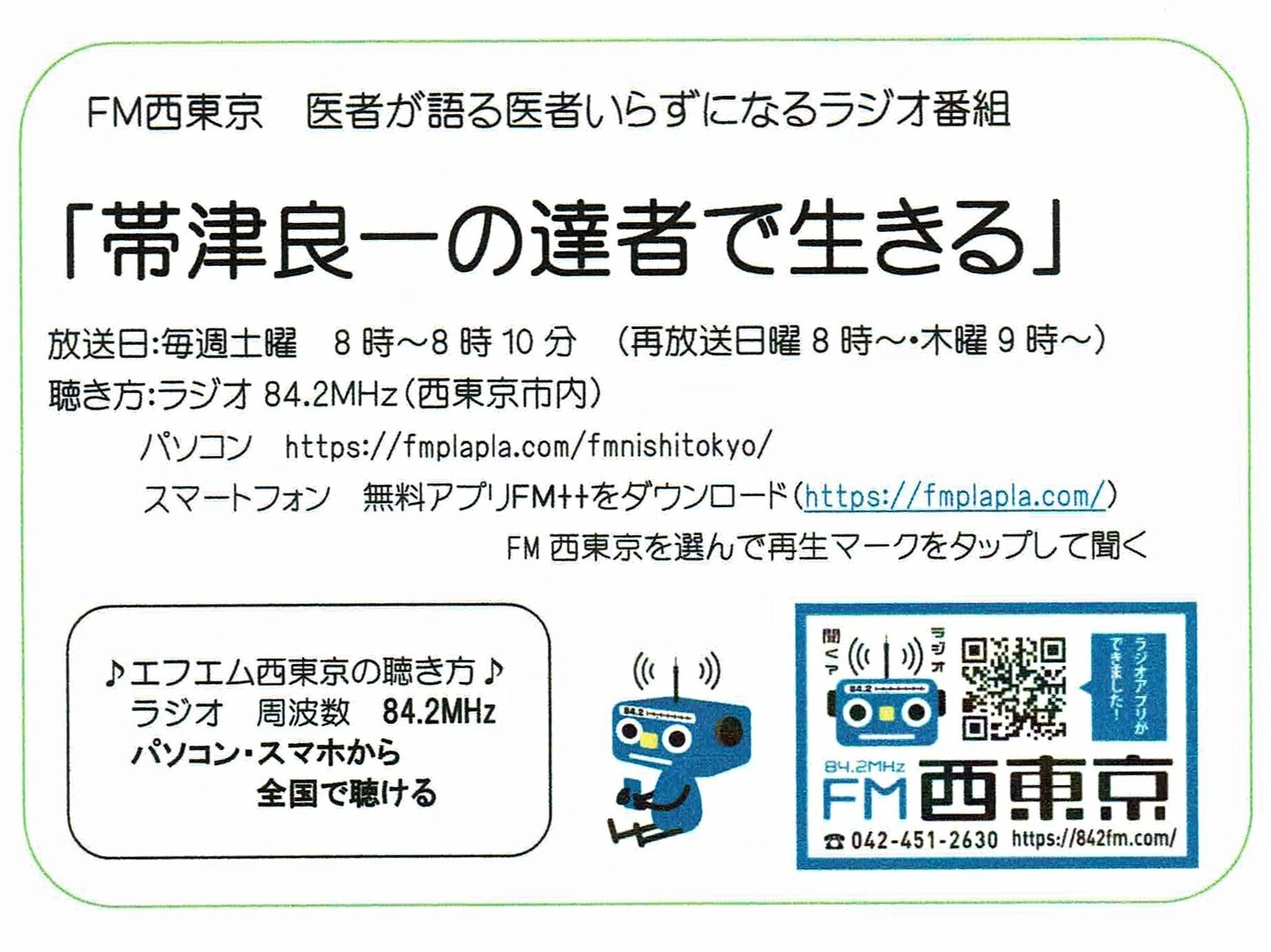具体的には、東京のローカルFM放送局のFM西東京の番組を通じて、御年85歳となられた帯津医師の元気なナマの声を、今年も毎週聴取者に伝えていくことで、このコロナ禍で疲弊した人々に元気を取り戻してもらいたいのです。 しかし、ここに来て、今まで番組提供してくれていた大口スポンサーが支援継続困難となり、番組存続の危機に直面しています。