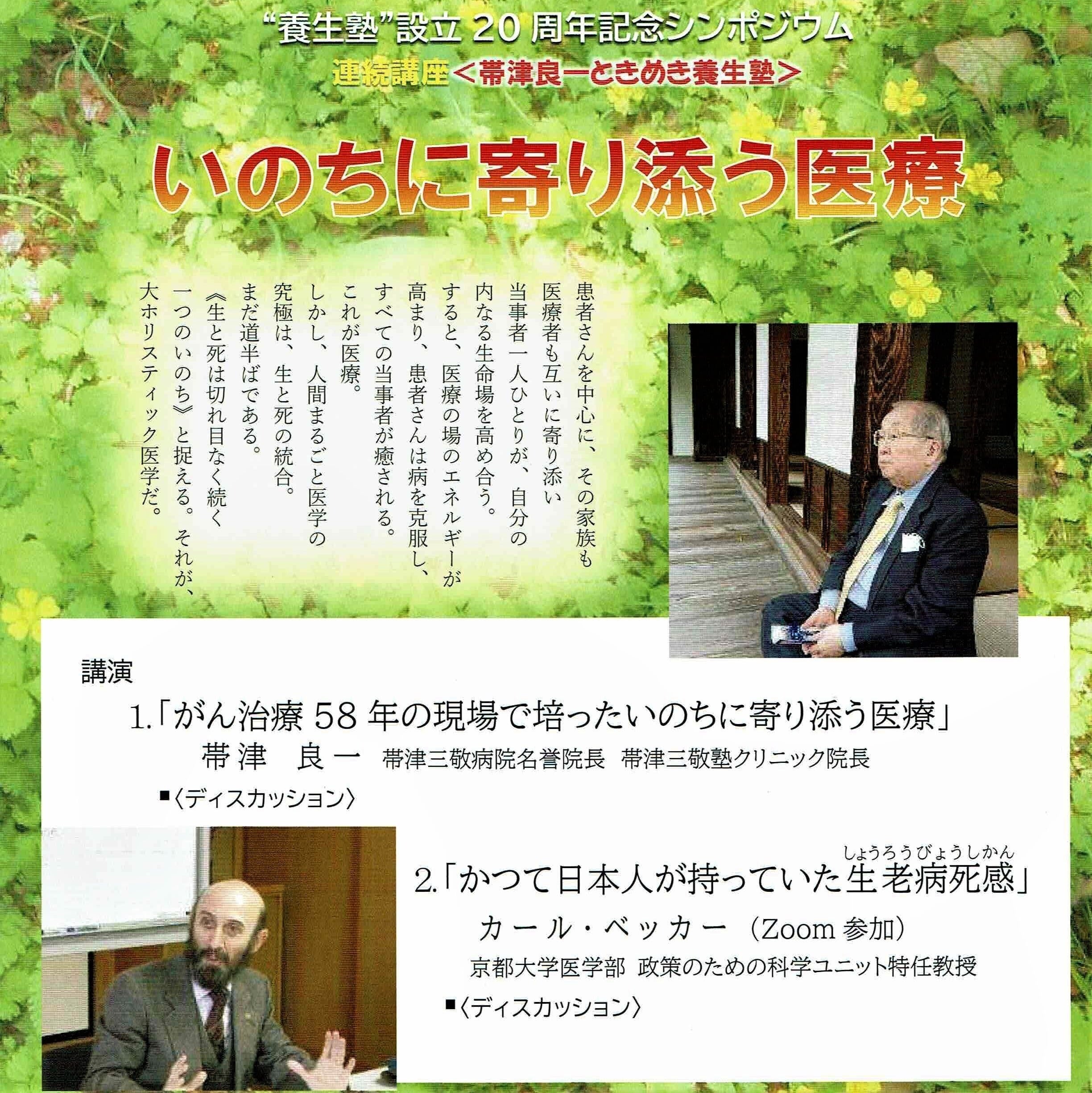 帯津良一医師は、死に至る病とされていた癌治療の世界で、西洋医学治療だけでは治せない患者が続くことに限界を感じ、人間全体をまるごと診る医学の必要性を思い、西洋医学の治療+代替療法を駆使して、がん患者の治療に取り組んできました。そして、その中で健康観や、いのちに寄り添う医療などを深く見つめ、従来の医療の枠組みに収まりきらない“自らいのちを正しく養う新しい養生法”を提唱するに至りました。つまり病気の快復を待つだけの養生ではなく、人間としての尊厳を保ちつづけながら、終わりなき自己実現の道を歩み続ける“攻めの養生”を提唱し、さらにその実践方法を提案してきました。
