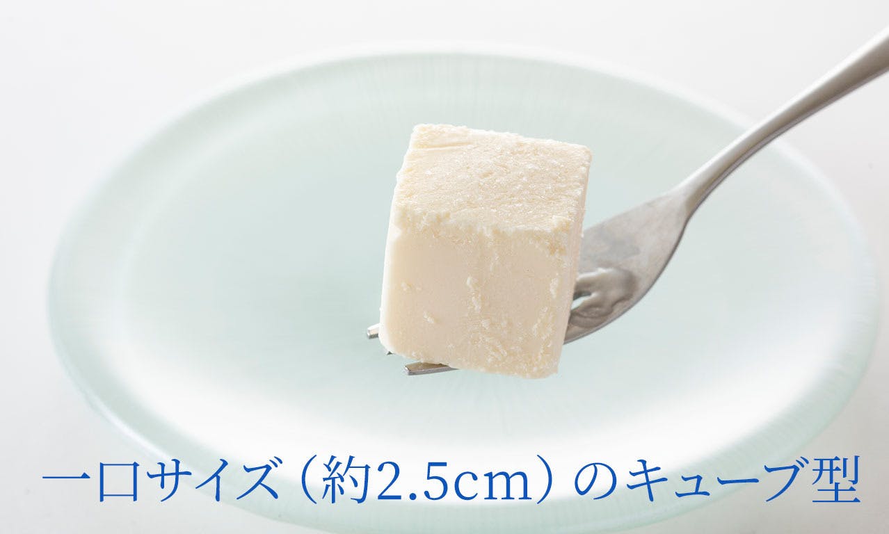 今回のアイスチーズケーキでは、女性でも一口で食べられることを目指しました。 試作を重ね、一辺約2.5cmのキューブ型を採用。ちょうど高級チョコレートのサイズ感です。女性だとほっぺが膨らむくらい。 この大きさが、口どけや味わい、満足感が一番よく感じていただると思っております。