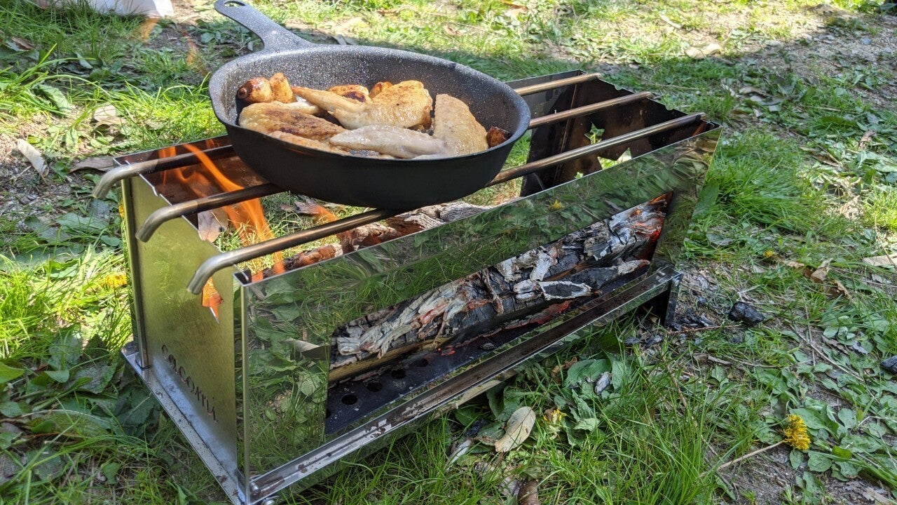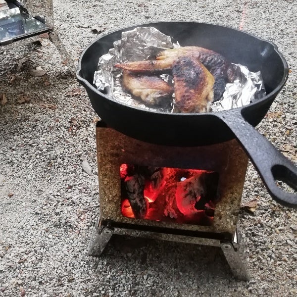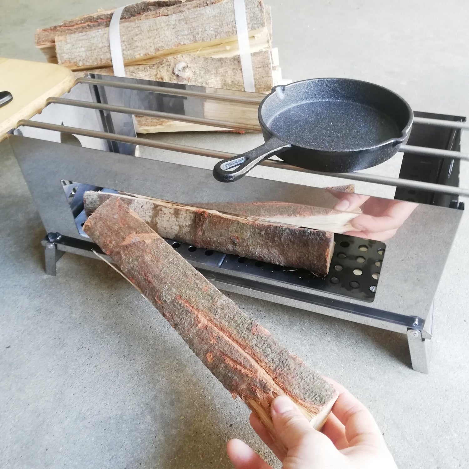 焚き火、料理するのに必要な薪のカットが大変でしたが、横長、側面開口を大きくすることで、薪カットの手間を大きく減らしました。