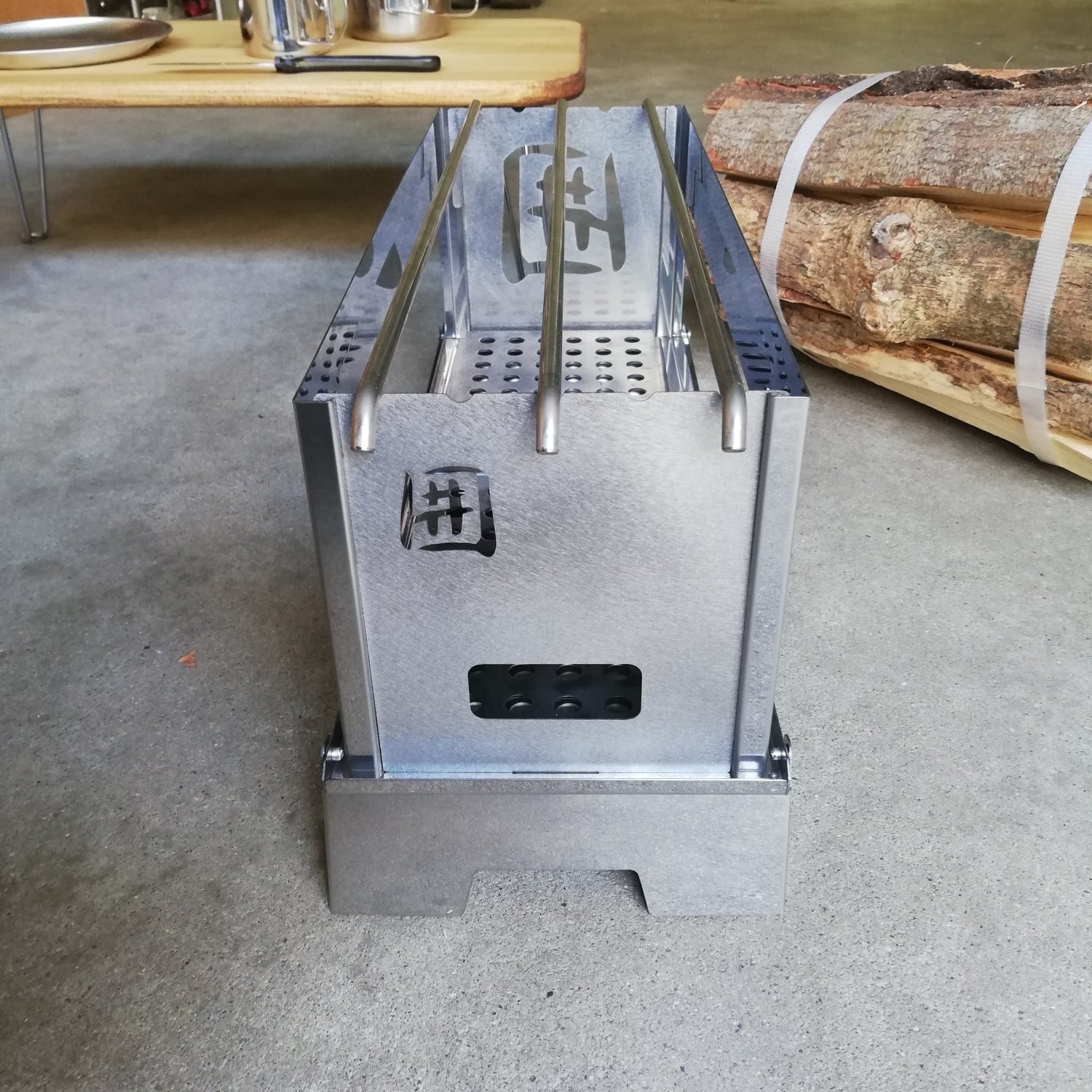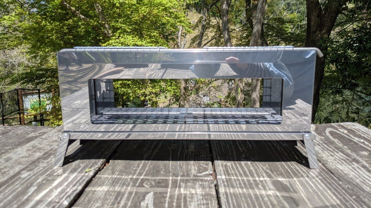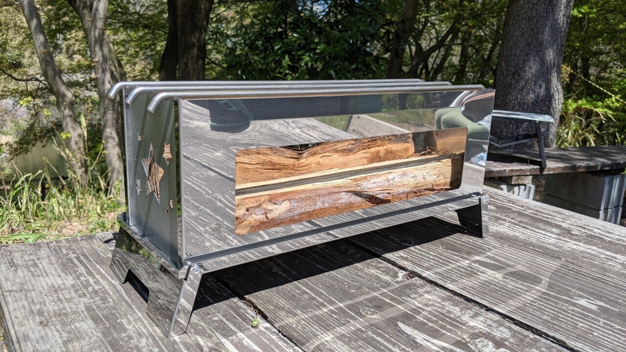 横長で側面開口が大きな、国産ステンレス焚火台です。