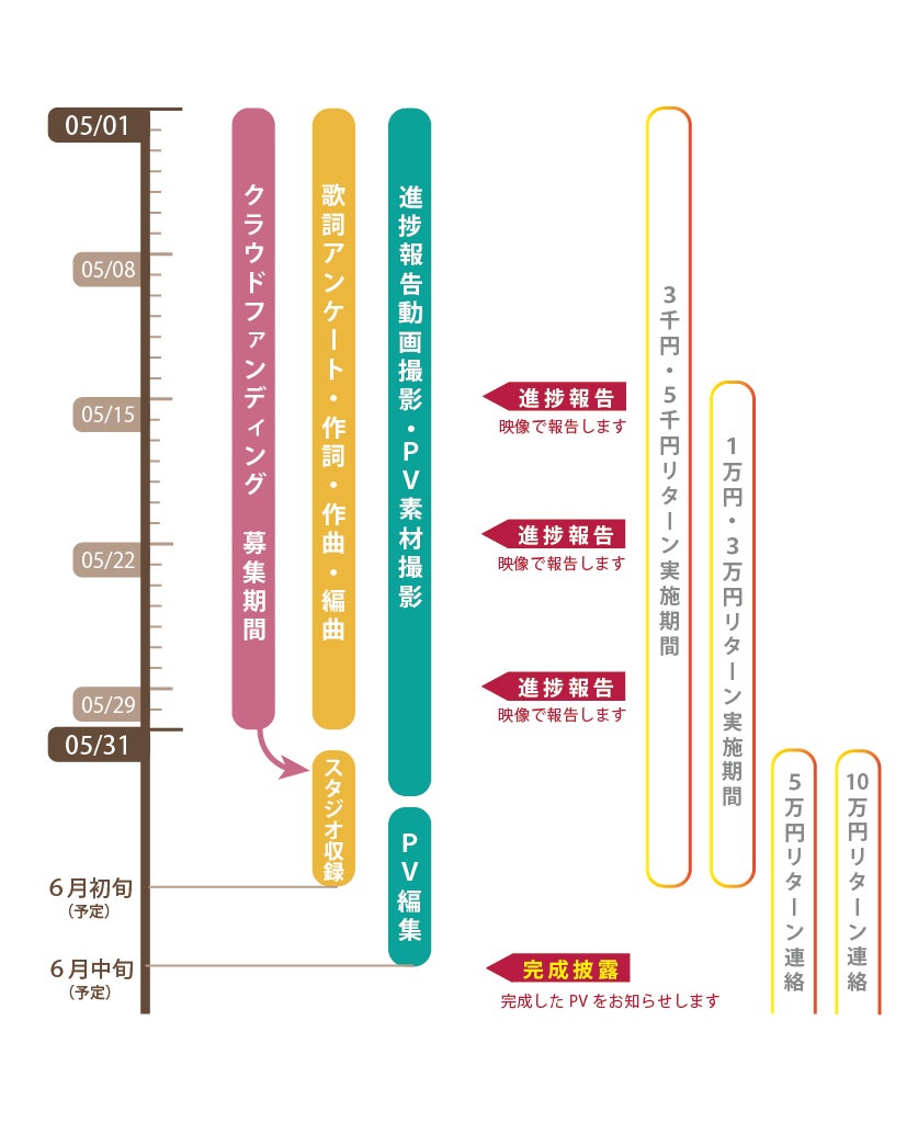 クラウドファンディング期間中は、週に1回程度、楽曲制作状況をYoutubeから発信します。チームの練習や歌詞作りの様子、作曲の進捗状況などを、映像でお知らせしてまいります。